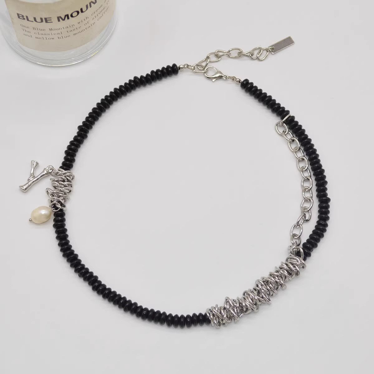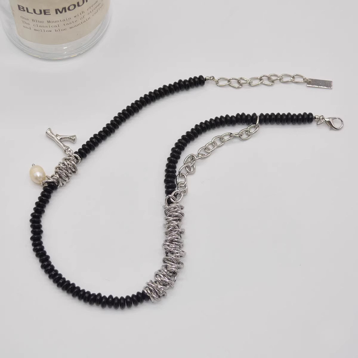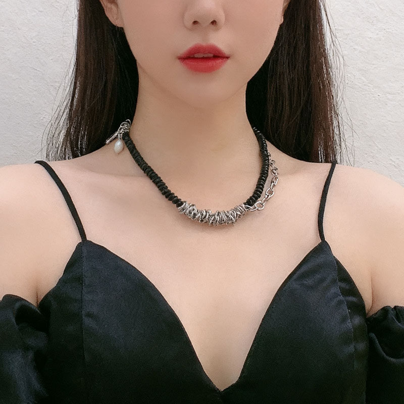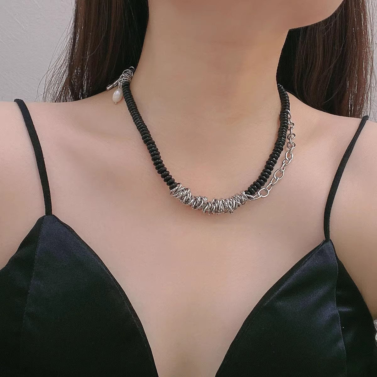 韩式嘻哈潮流黑色串珠拼接项链女气质复古高级感锁骨链设计感颈链