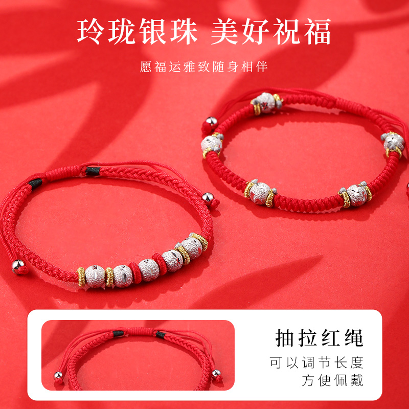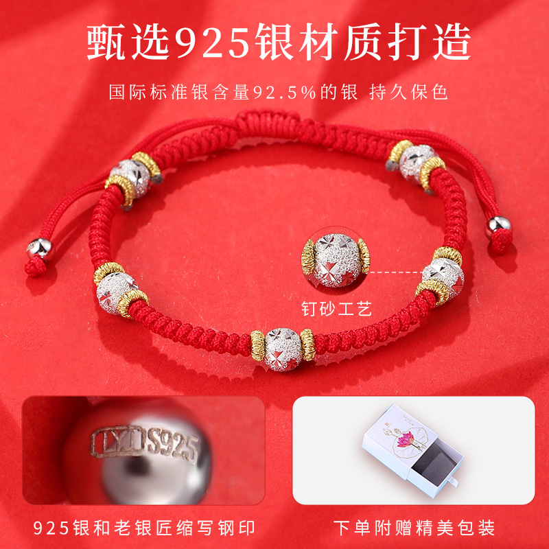 老银匠s925银红绳时尚简约女生手工编织本命年情侣转运珠纯银手链