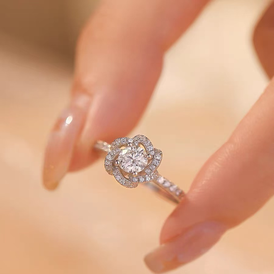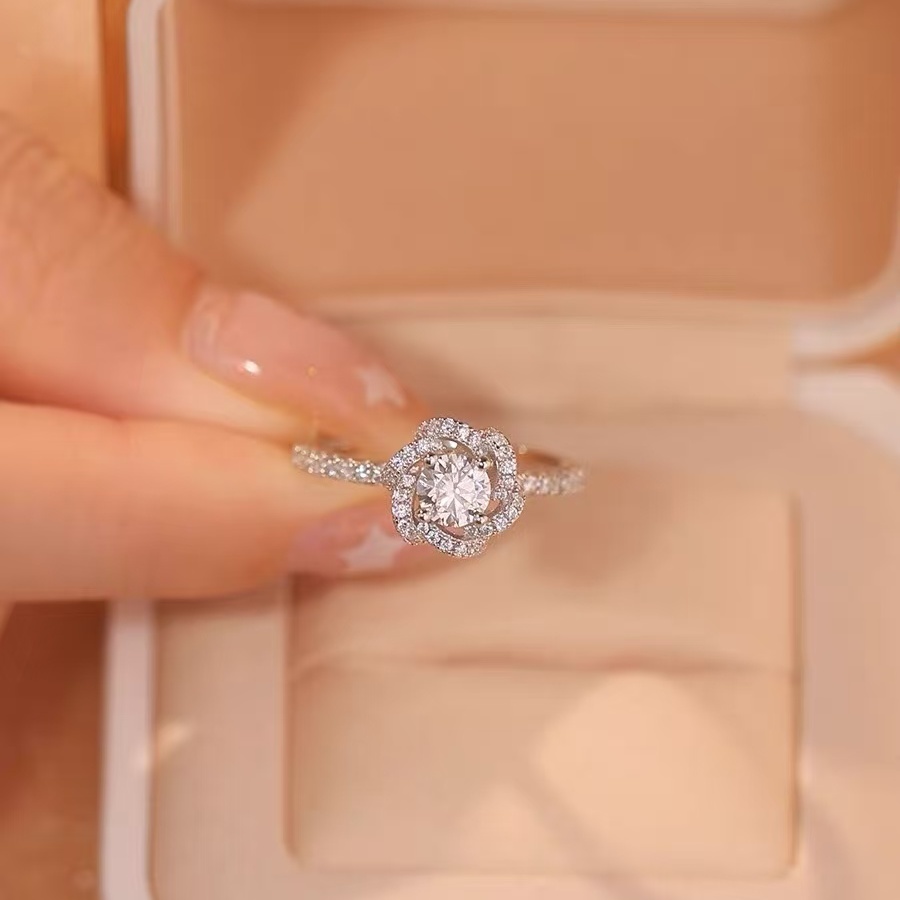 s925银满钻玫瑰花戒指女士轻奢小众设计感时尚可调节结婚求婚戒