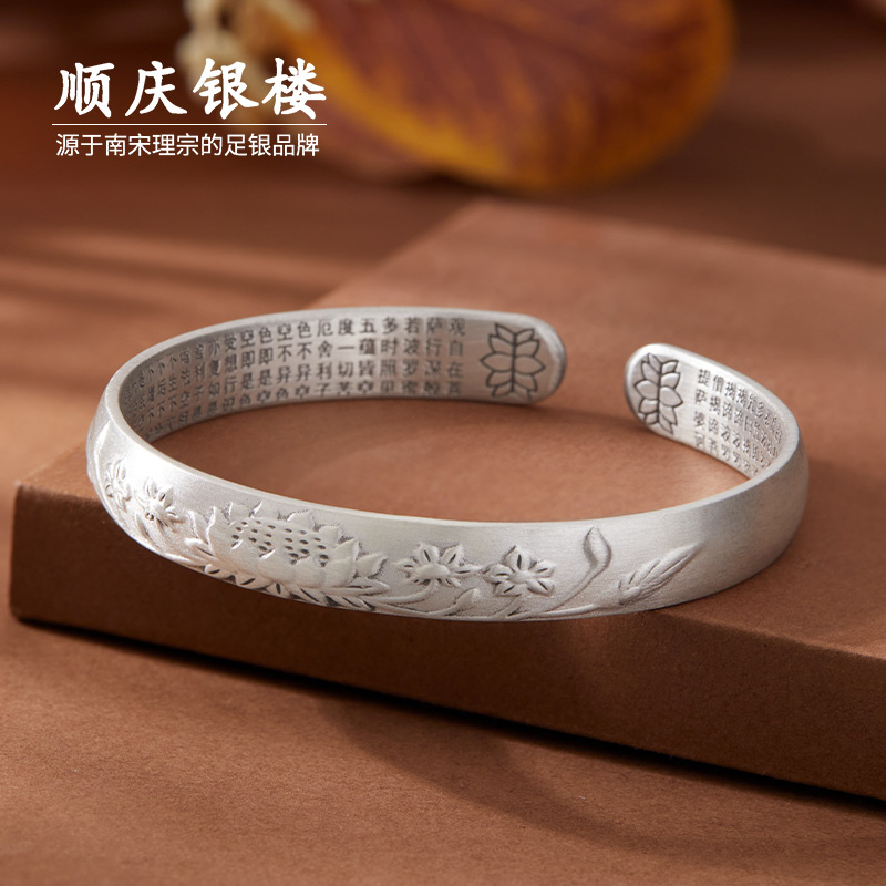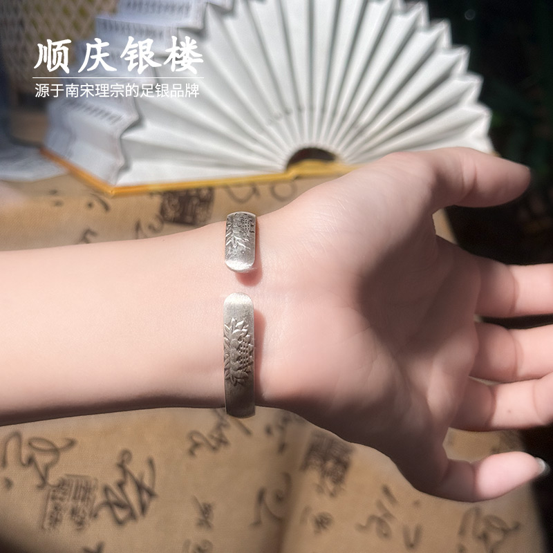 顺庆银楼S9999纯银手镯女复古并蹄莲花银镯子民族风新中式送长辈