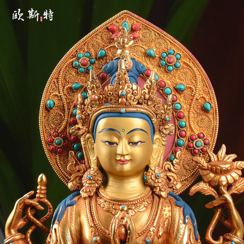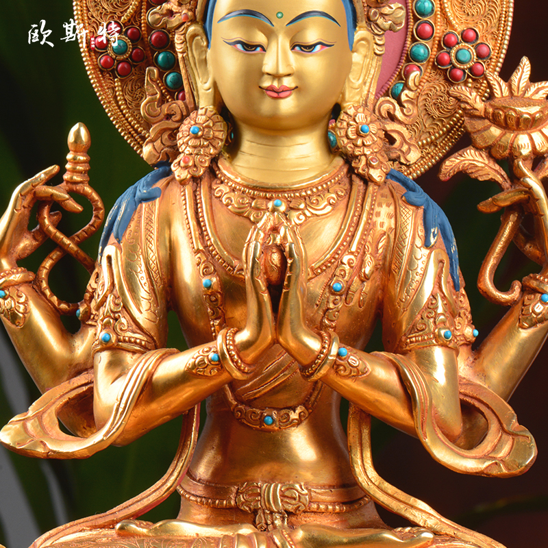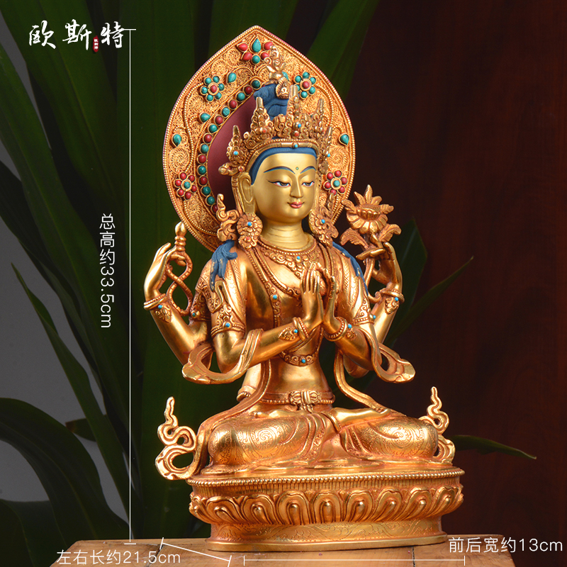欧斯特 尼泊尔四臂观音摆件铜鎏金手工掐丝10寸居家玄关铜像