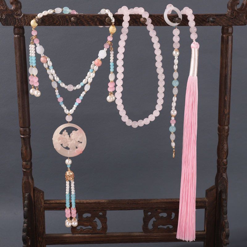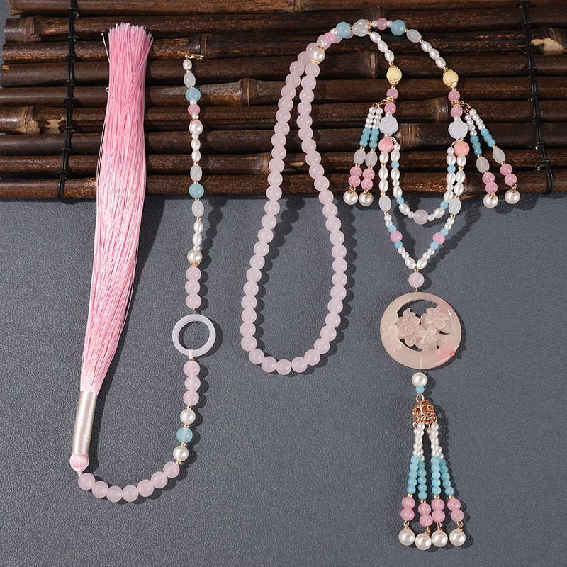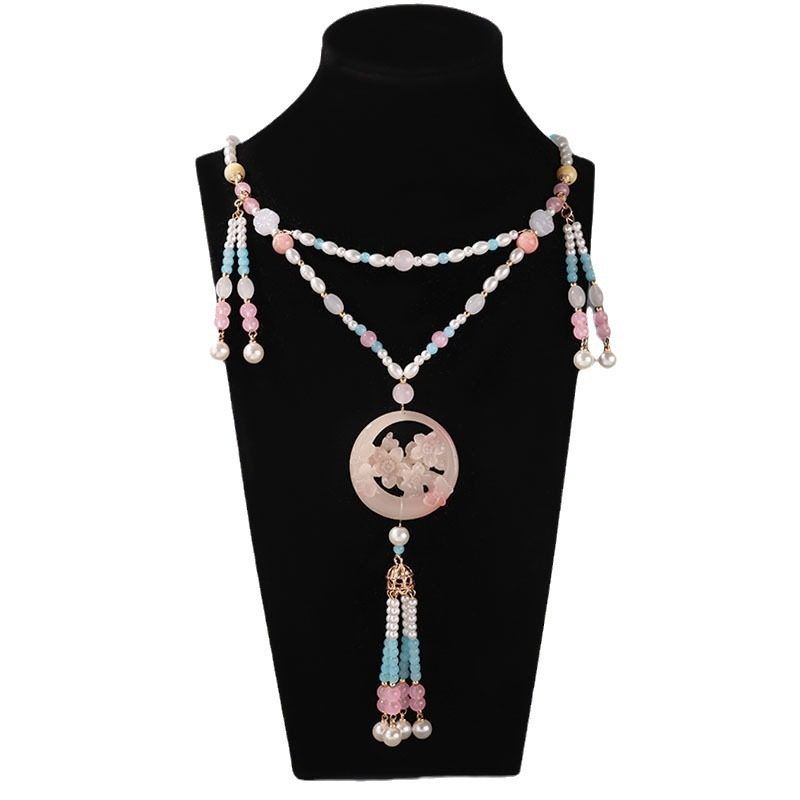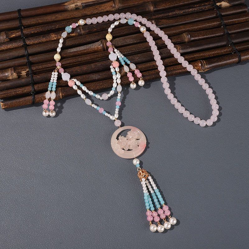 新中式琉璃串珠珍珠花朵圆圈流苏毛衣链百搭长款汉服项链配饰挂件