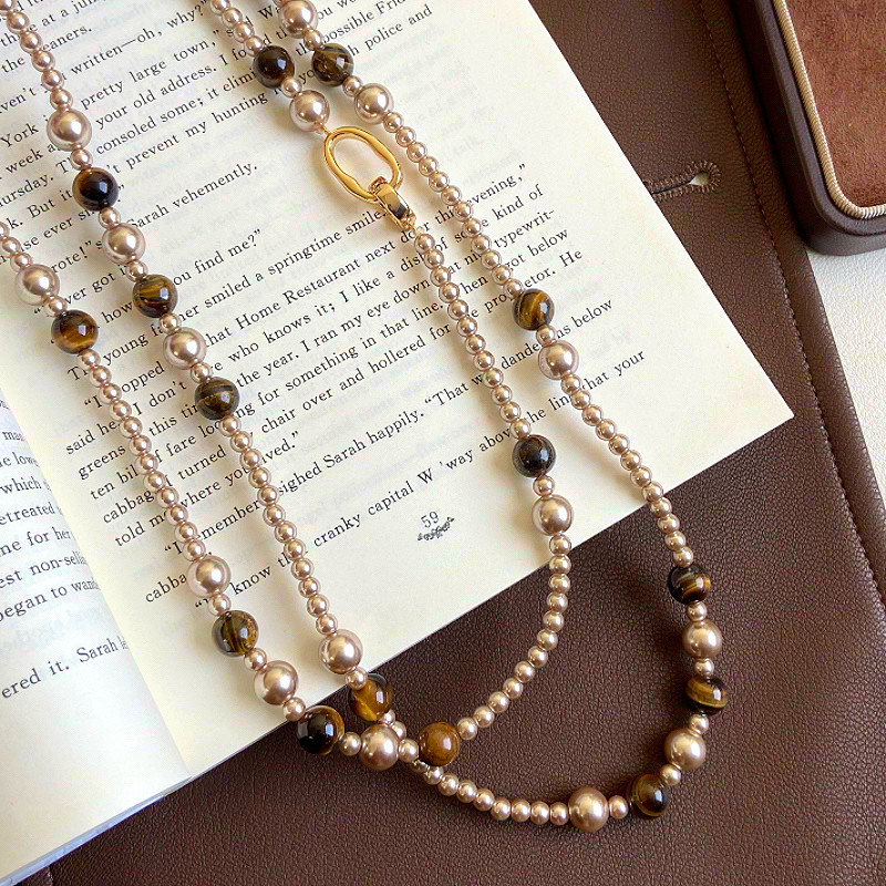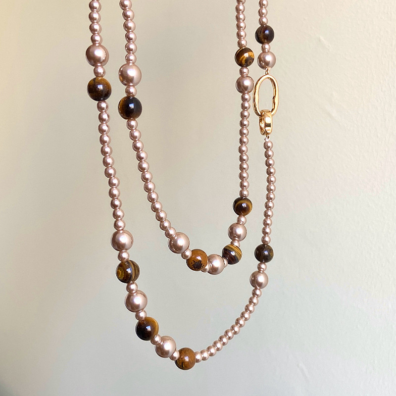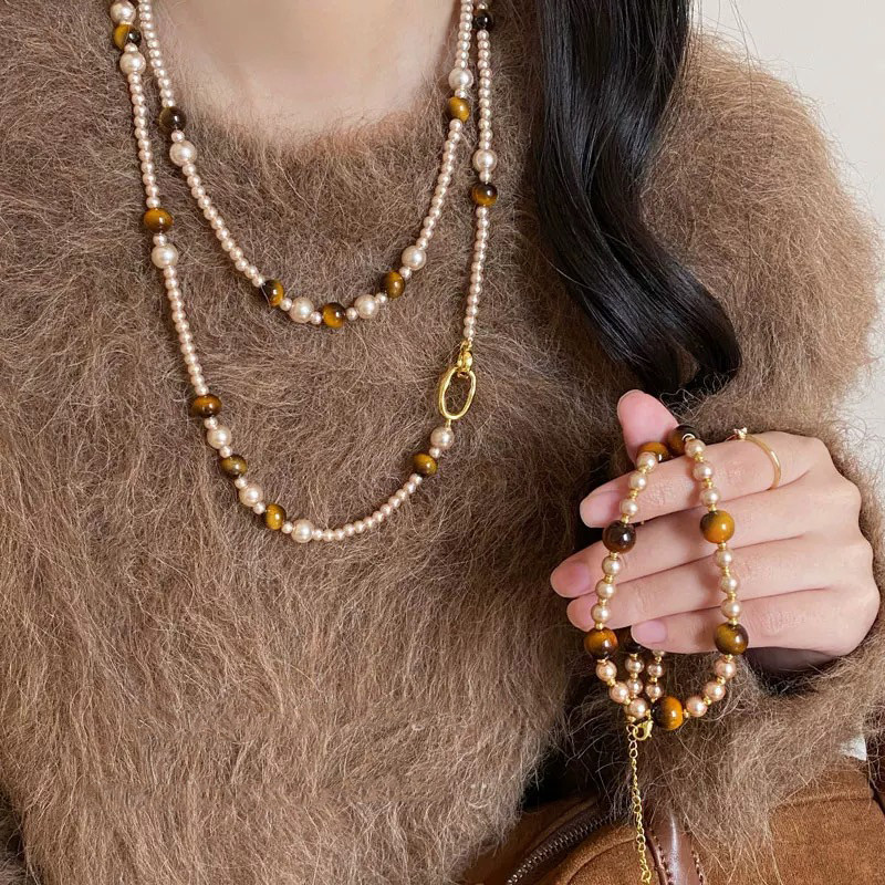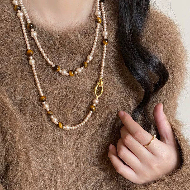 天然虎眼石香槟金施家珍珠项链女双层叠戴长款毛衣链美拉德颈链