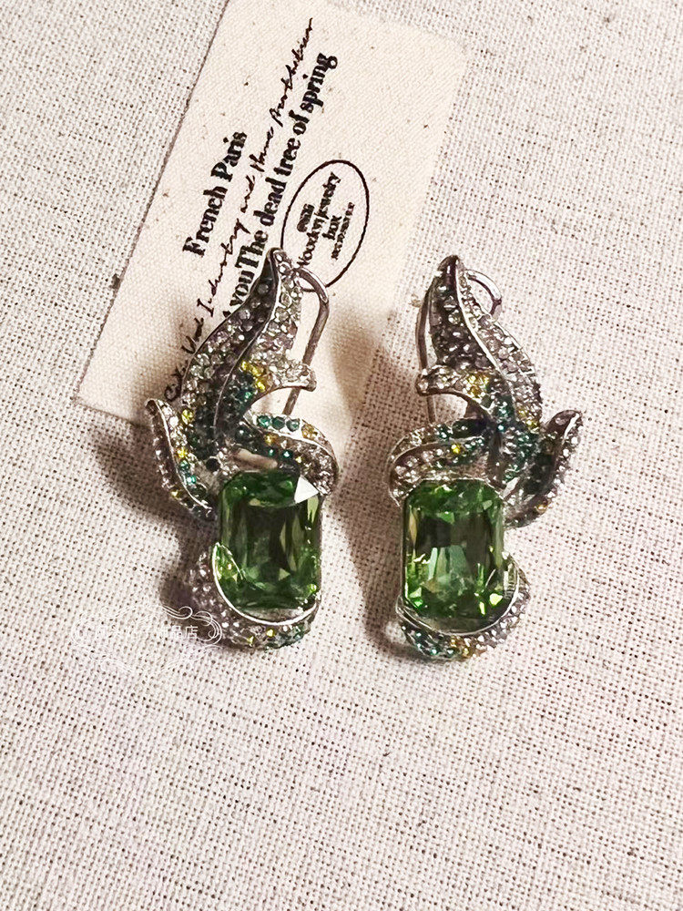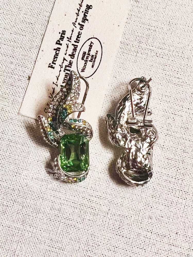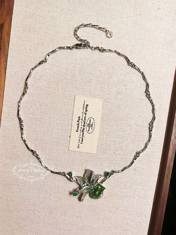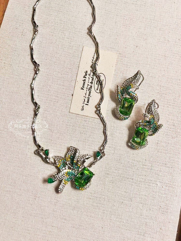 欧美宫廷中古vintage复古气质浅绿色宝石满钻花朵短款项链耳环女