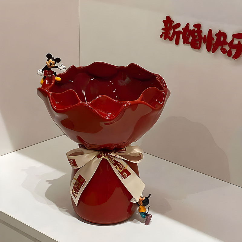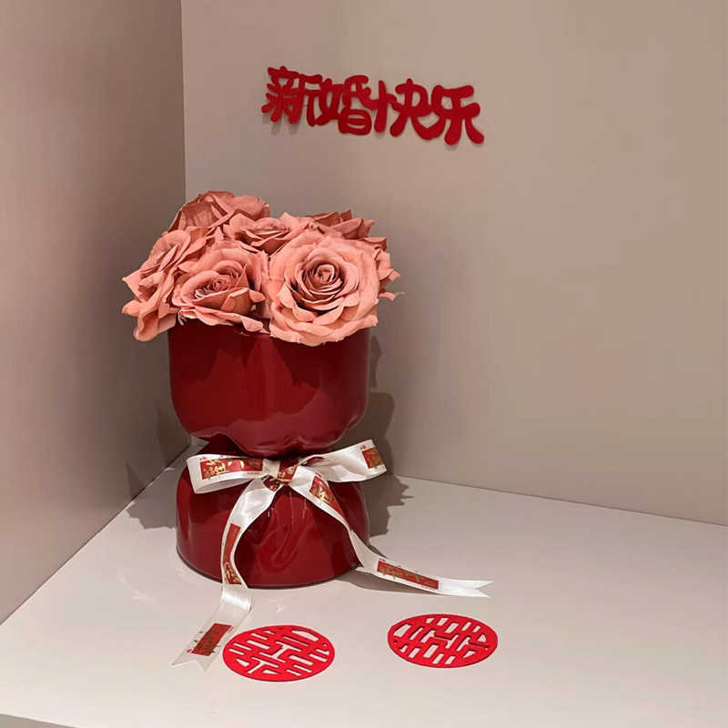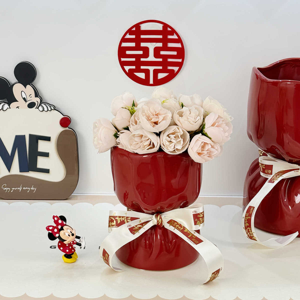 新婚礼物创意红色陶瓷花瓶插花高级感客厅桌面装饰结婚伴手礼摆件