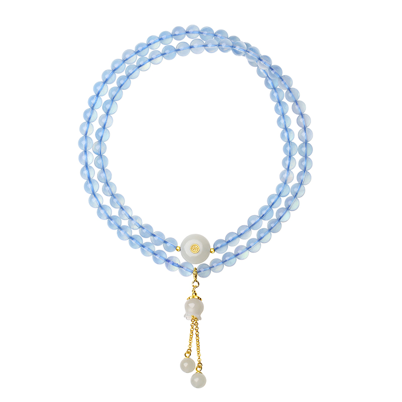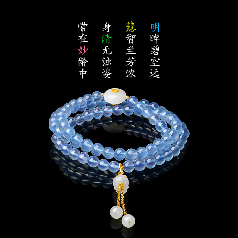 中国风天然海蓝宝手链和田玉平安扣六不散人国潮多圈手串生日礼物