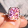 新款欧美奢华镶嵌黄钻双色戒指 经典公主方形粉水晶开口订婚女戒
