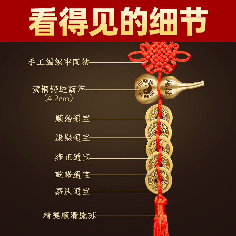 五帝钱门对门开口纯黄铜八卦葫芦挂件压门槛大门中国结挂饰朱砂