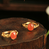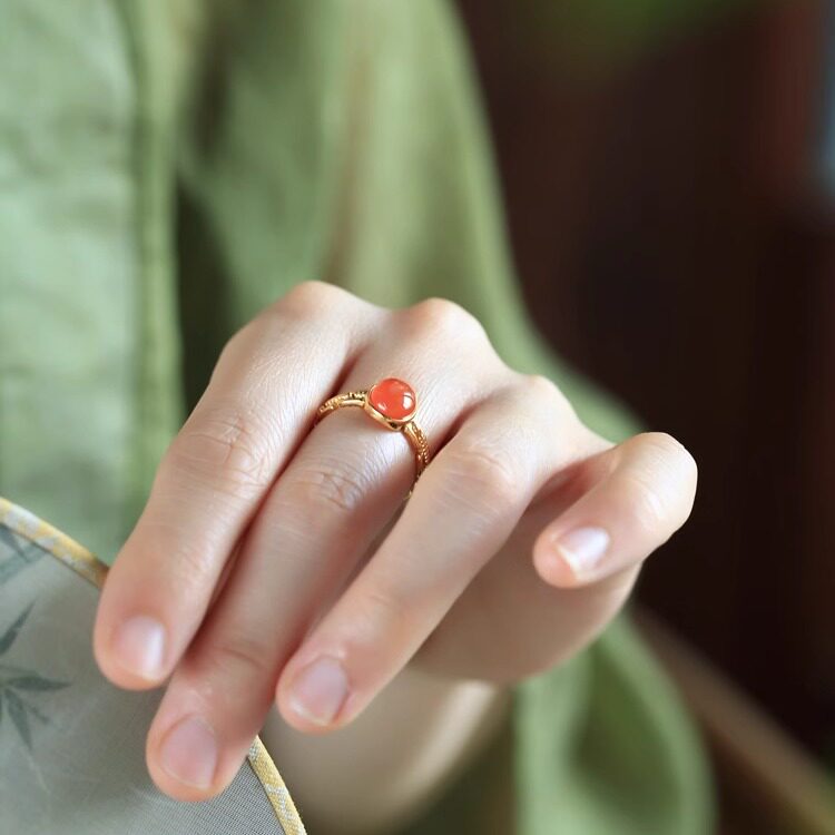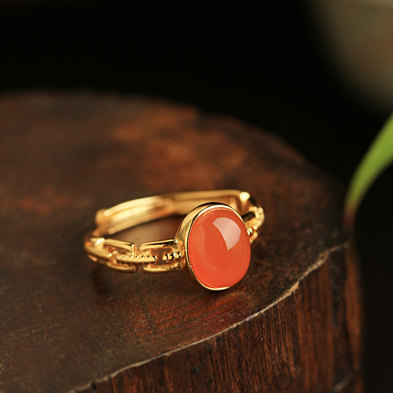 小银匠天然南红纯银高级红色蛋面戒指女款金包银红宝石金镶玉玛瑙