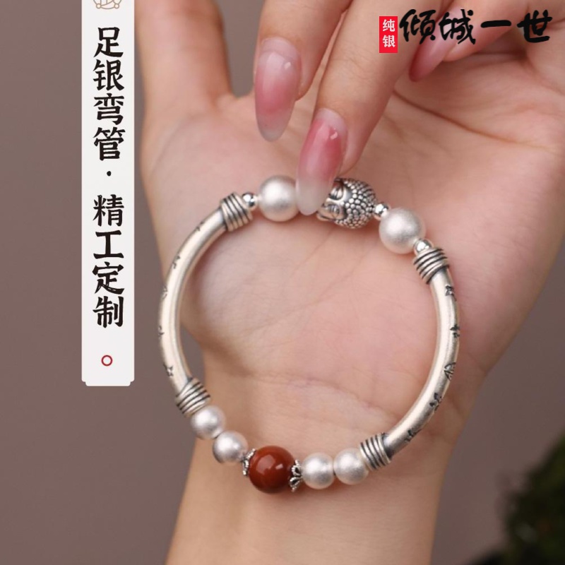 999纯银《佛在心中》足银双面佛首足银弯管手链新中式生日送礼物