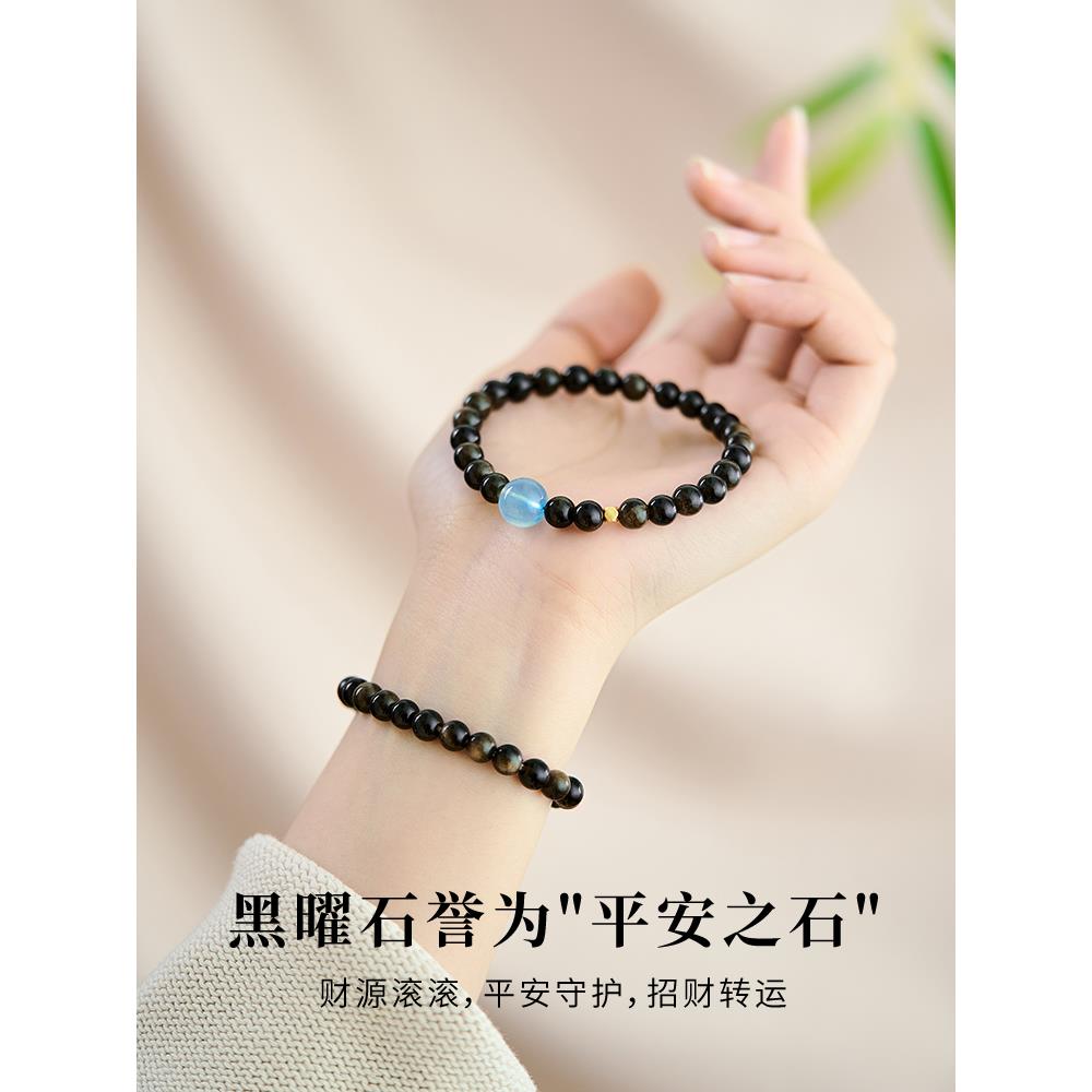 黑曜石手串女款水晶手链五行补水天然海蓝宝黑色碧玺原石佛珠串珠