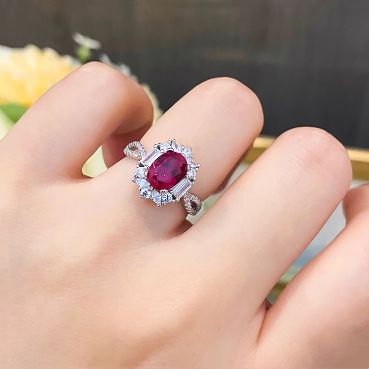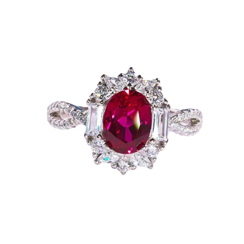 PT950铂金D色莫桑石扭臂红宝石鸽子蛋钻戒纯银彩钻戒指女轻奢时尚