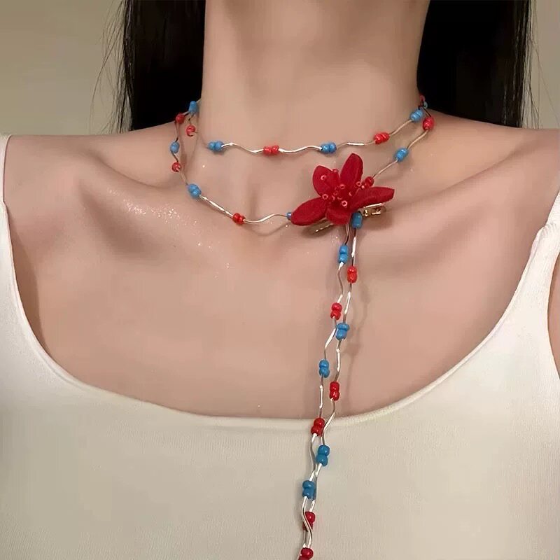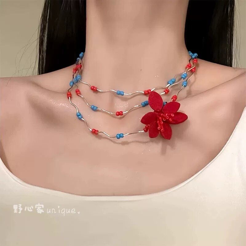 春日纯欲风花朵项链红蓝色串珠锁骨链春日明媚choker高级感颈链