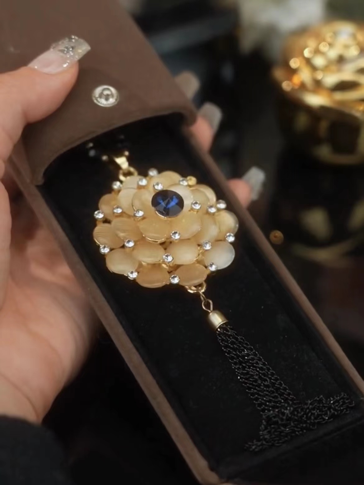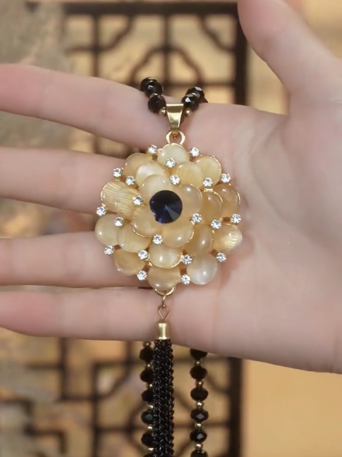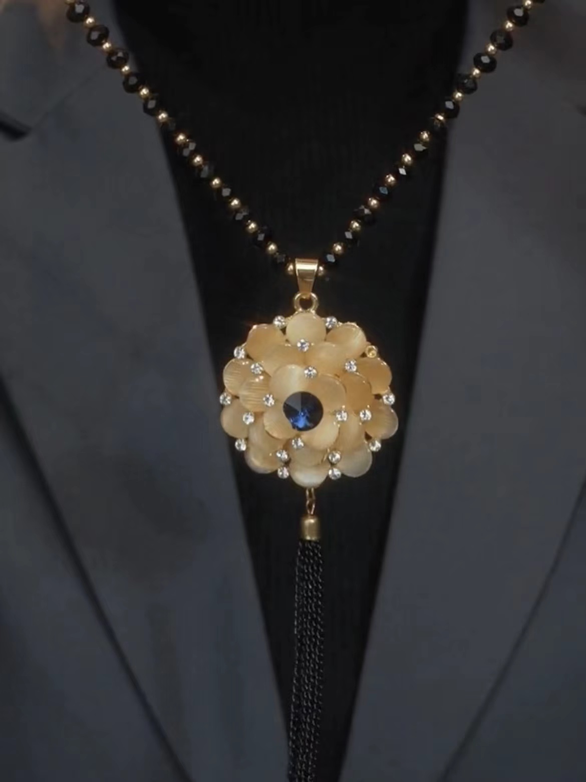 2024年新款潮秋冬百搭长款猫眼石毛衣链女高级感轻奢复古花朵项链