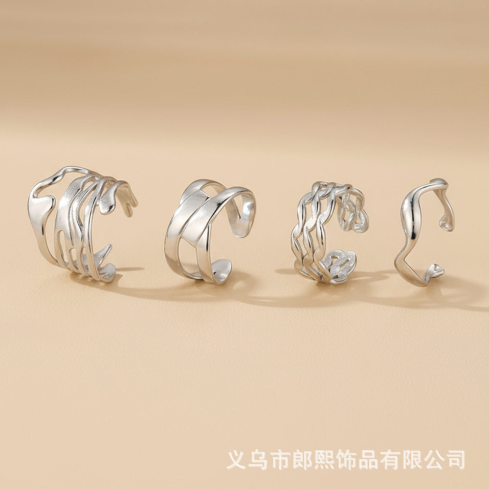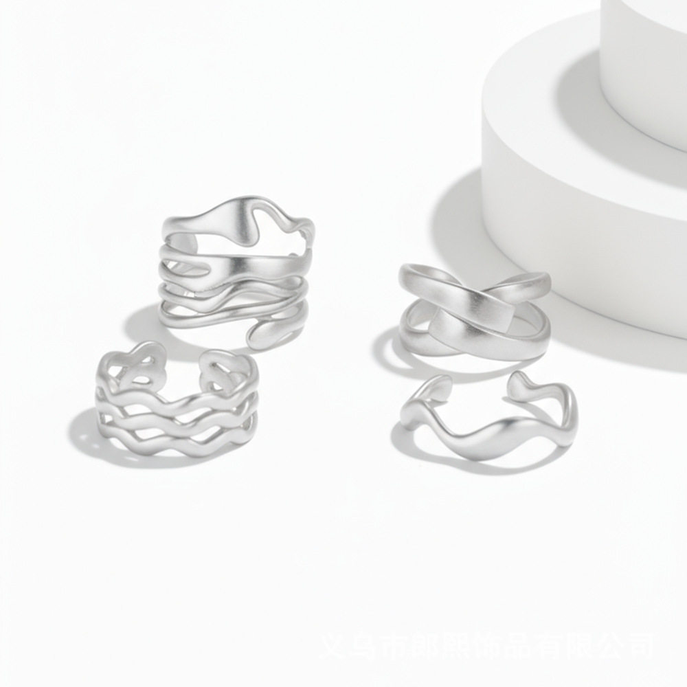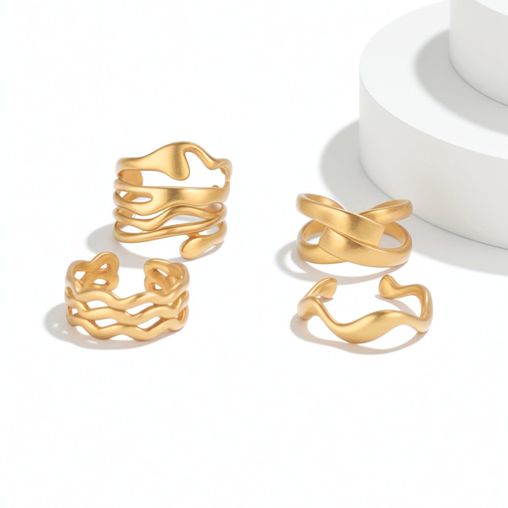 欧美钛钢镀18K金开口戒指套装女士线条不规则ins时尚波浪纹指环