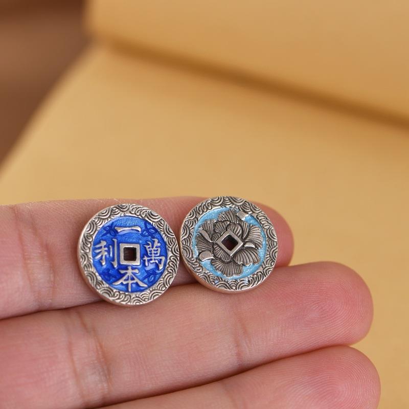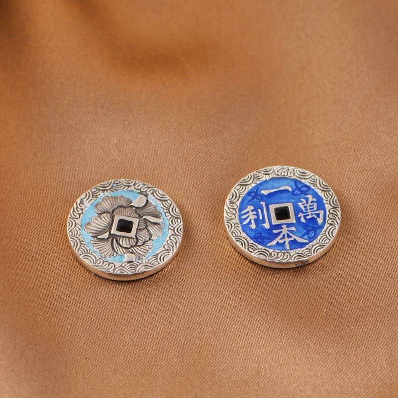 网红- 足银吊坠 复古老银珐琅彩工艺如意水波纹老钱花钱银钱配件