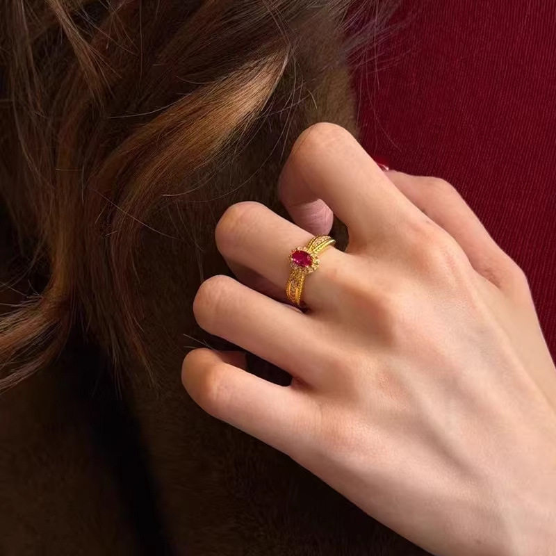 越南沙金轻奢高级感复古微镶红钻红金织梦古法金活口戒指女戒批发