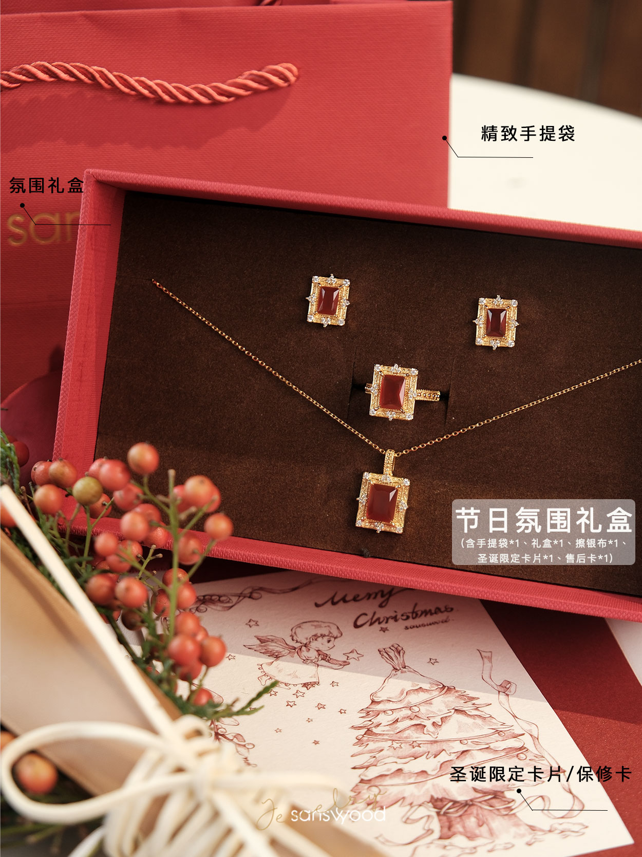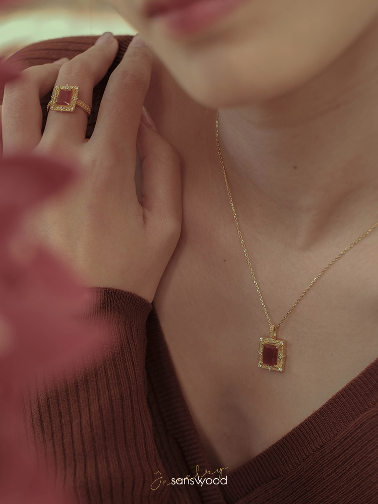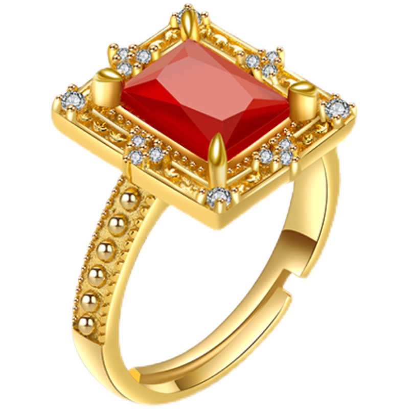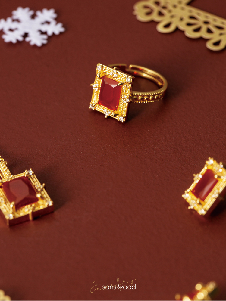 sanswood《晚宴时刻》复古金色相框天然红玛瑙开口戒指女纯银高级