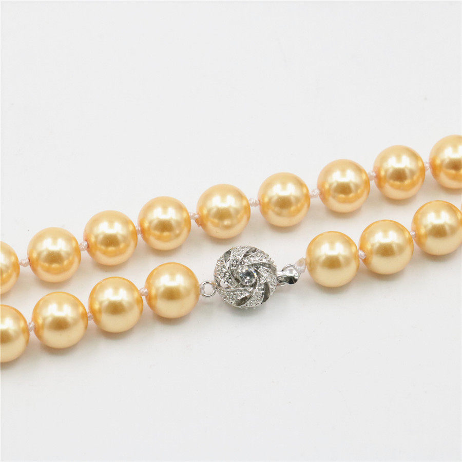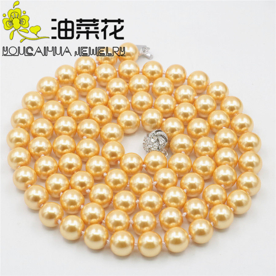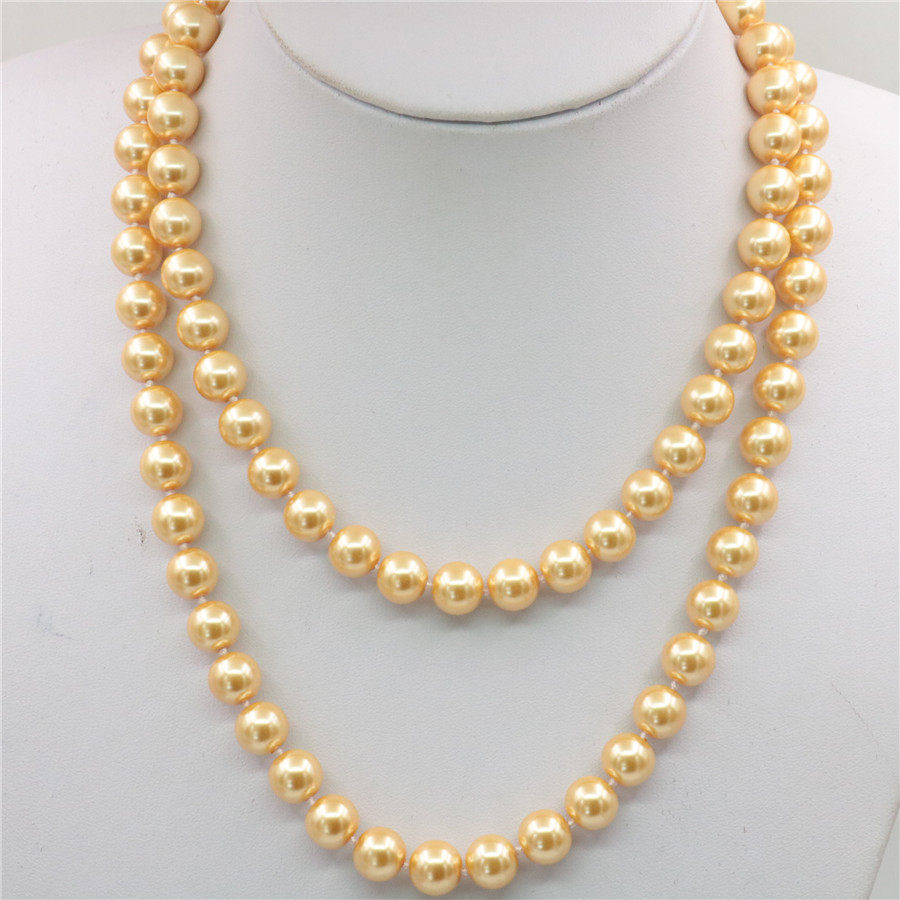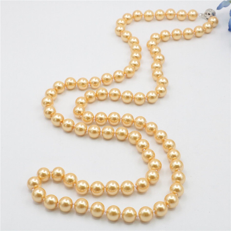 10mm36英寸长款金黄色玻璃珍珠项链 配太阳花扣可双层高贵毛衣链