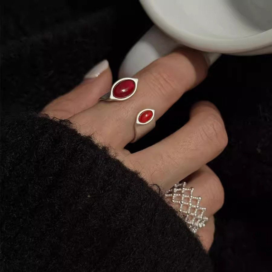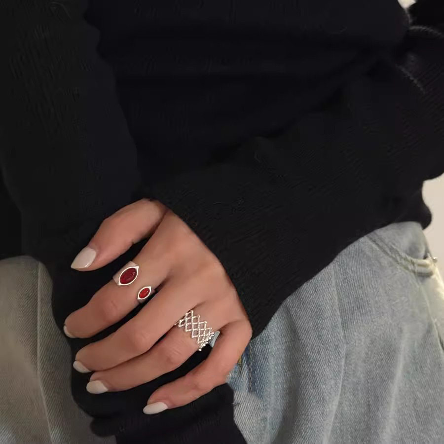一恋红色椭圆戒指女精致优雅个性开口指环网格设计感食指