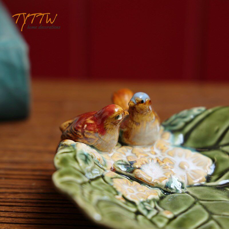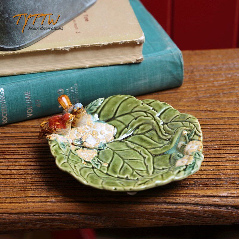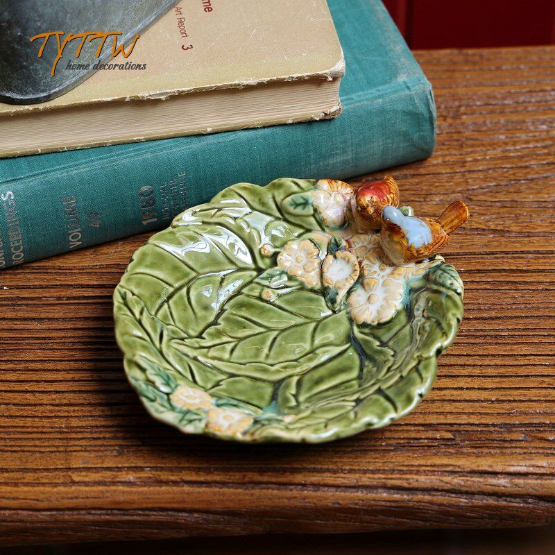 欧式陶瓷家居饰品绿色荷叶小鸟陶瓷釉面装饰盘子瓜子碟果盘摆件