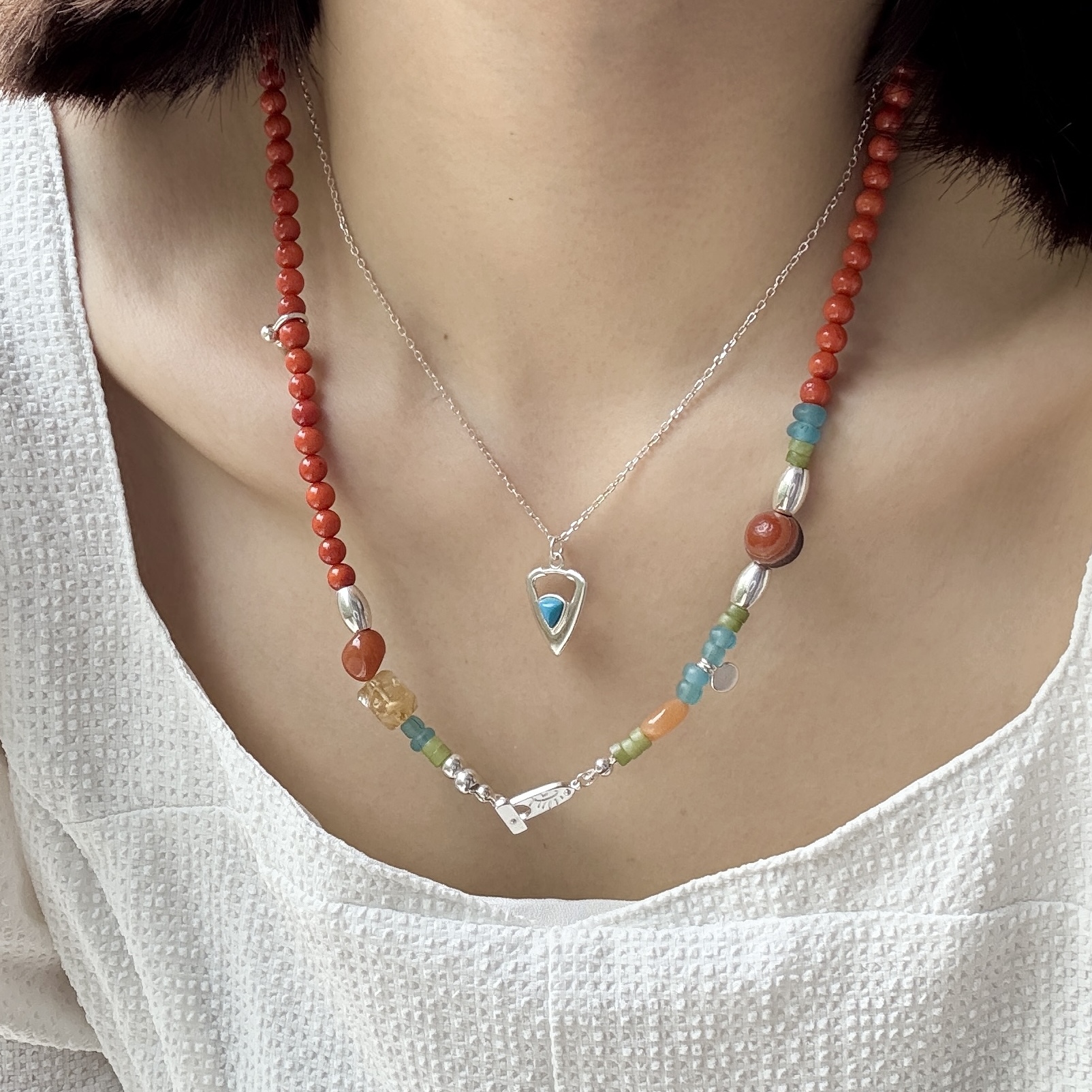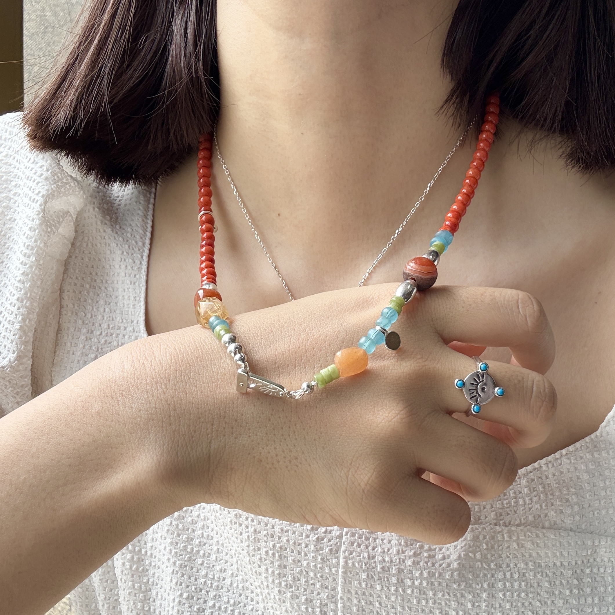 现货Ensage纯银橙色玛瑙琉璃珠橄榄石不规则串珠高级小众项链
