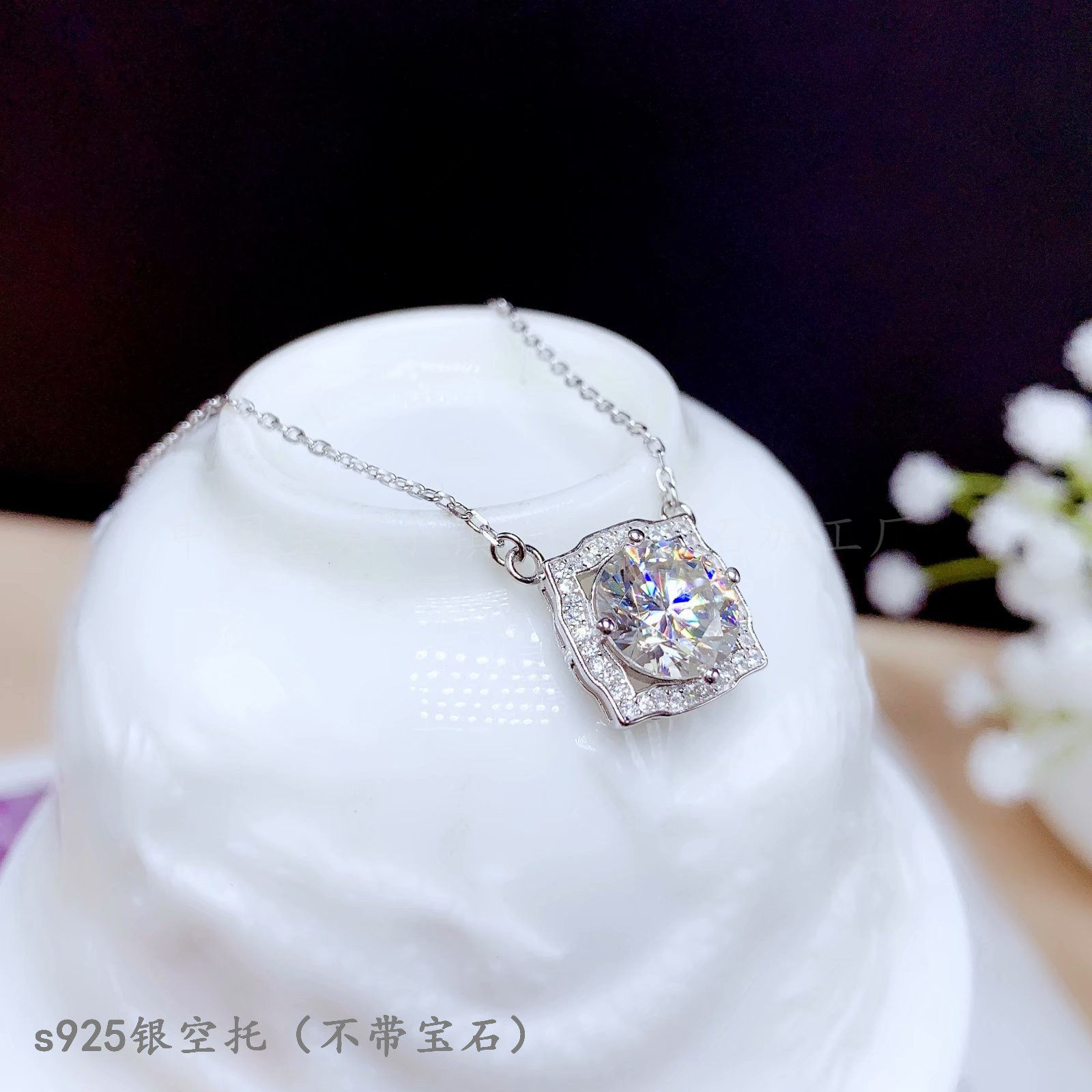 s925纯银 圆形6.5 8 9mm吊坠锁骨链空托 蛋面晶石1 2 3克拉莫桑钻