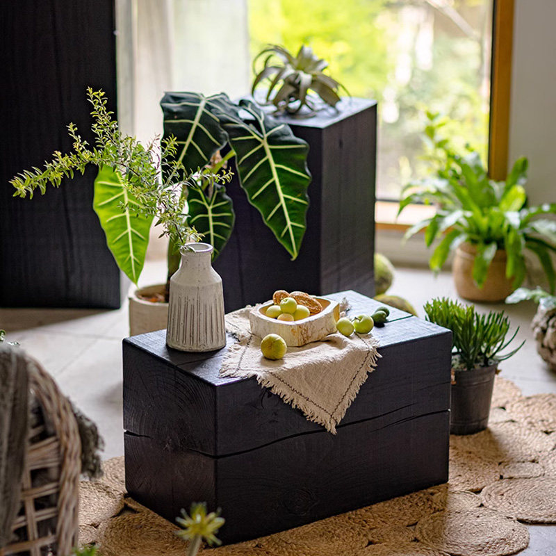 侘寂风实木方形黑色木墩仿古置物台花架软装展示台民宿装饰摆饰