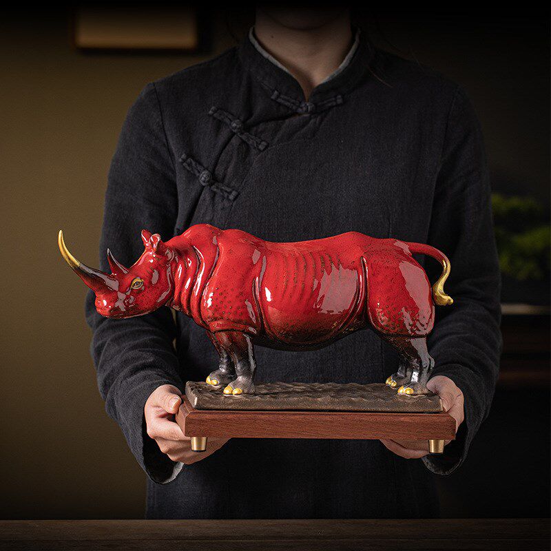 大号红色陶瓷犀牛摆件雕塑u招财客厅酒柜玄关公室桌面装饰工艺品