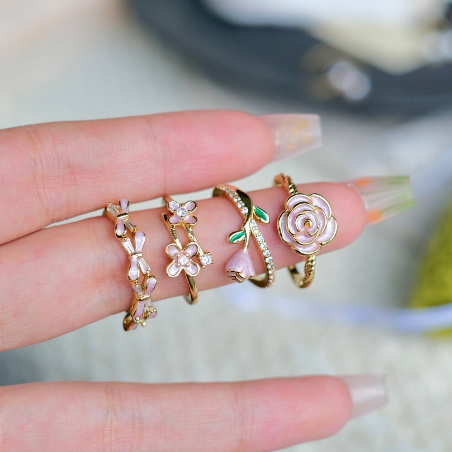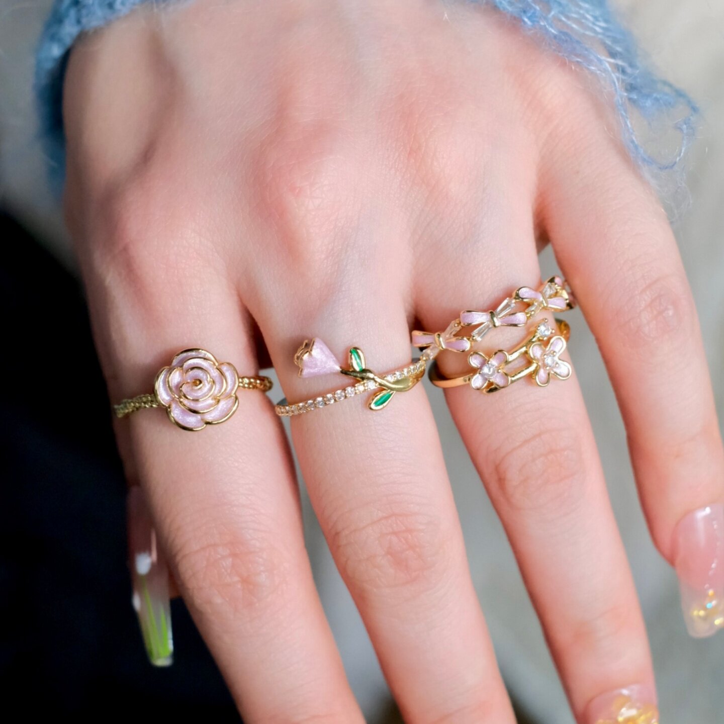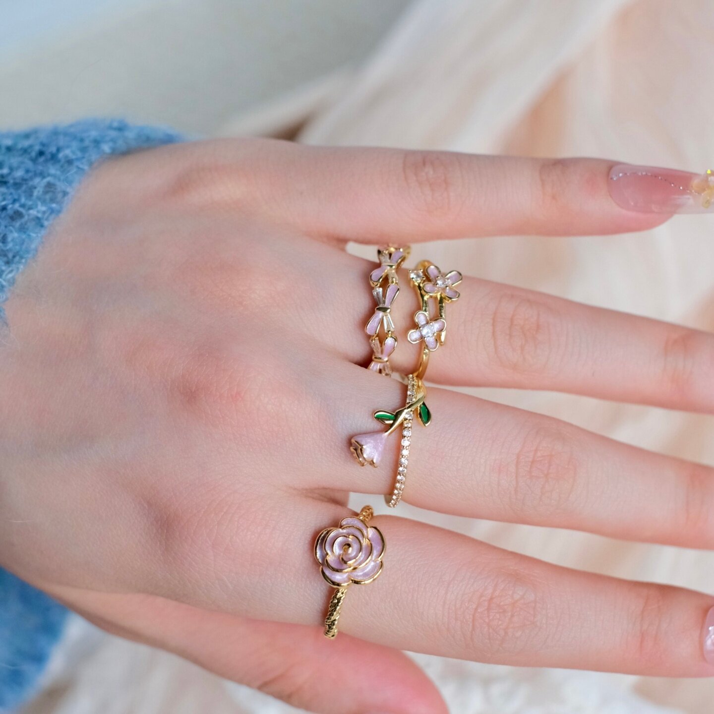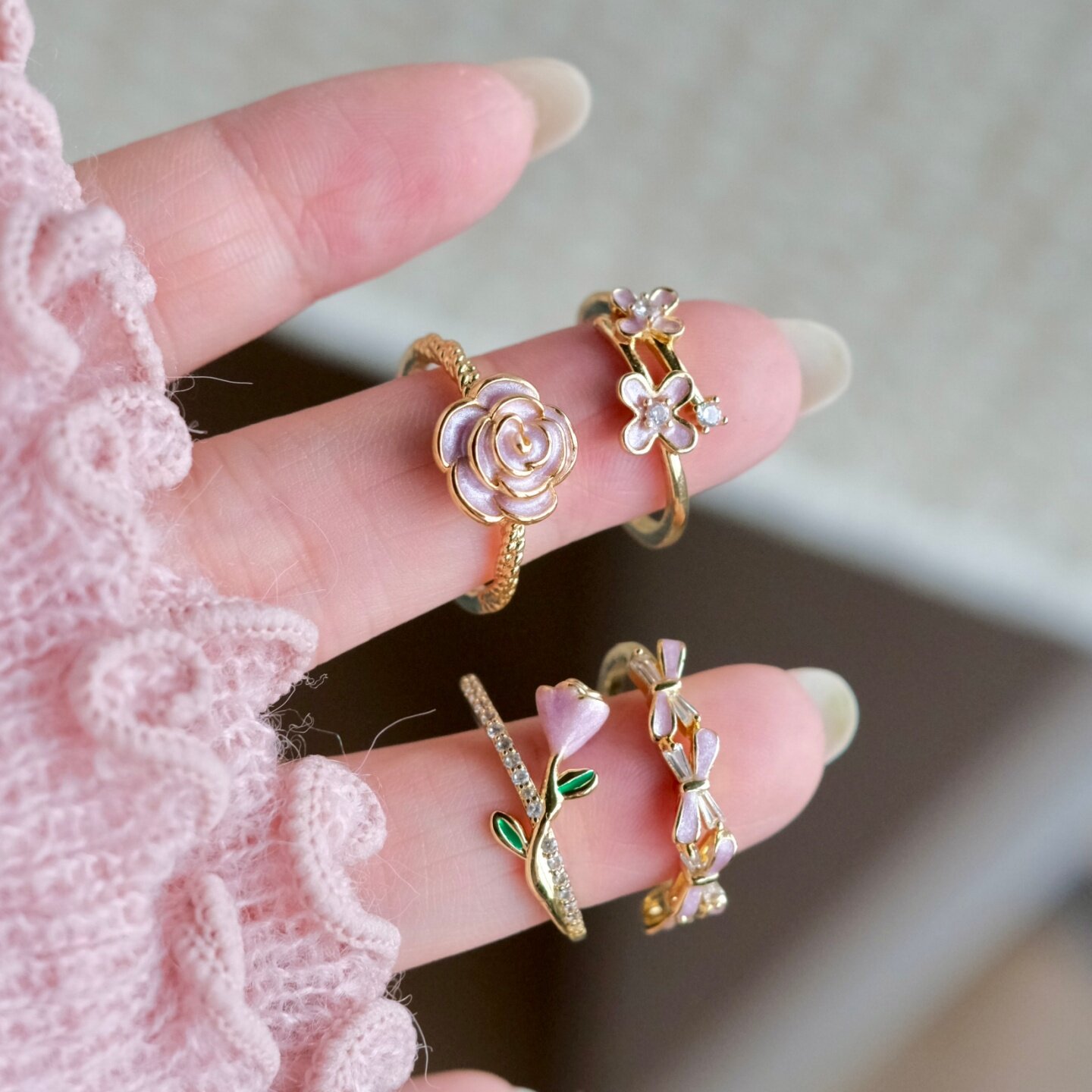 《蔷薇花园》独特清新超仙温柔珐琅花朵粉紫色戒指叠戴可调节指环