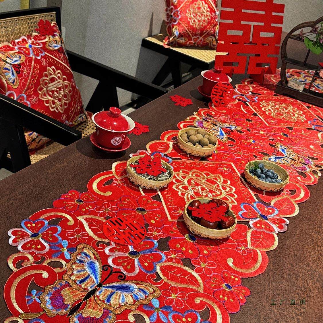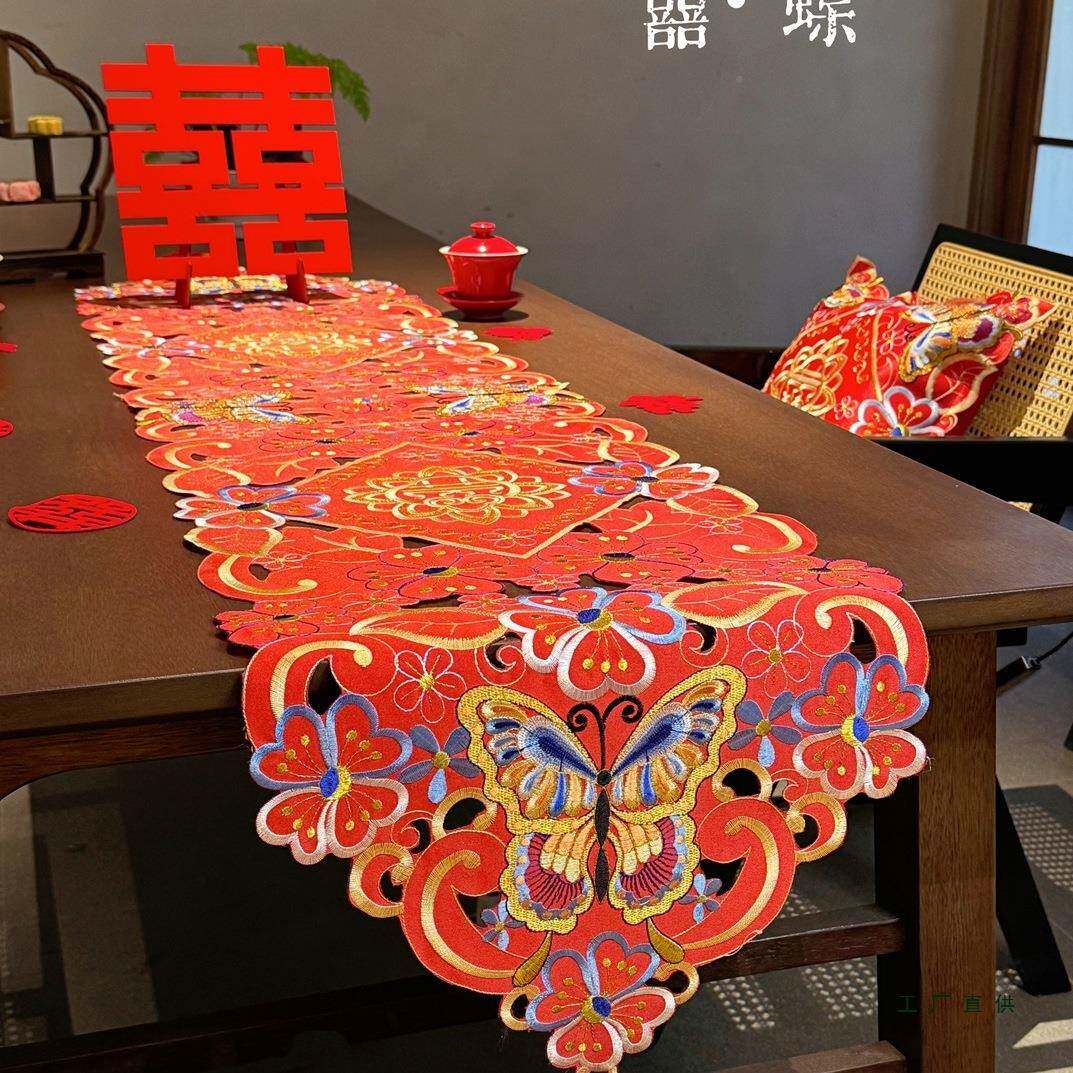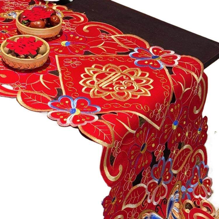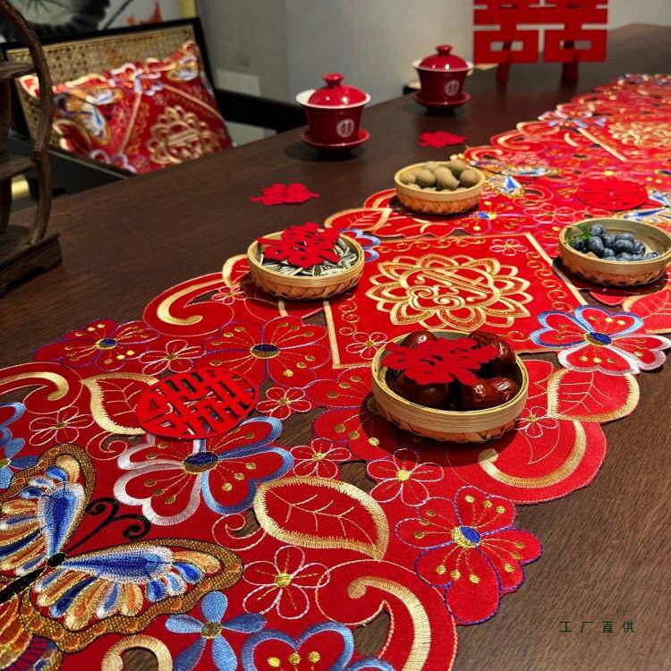 刺绣生活搭建所·蝶摆F99M7T6H新中囍式婚礼刺绣桌旗喜庆字喜红色