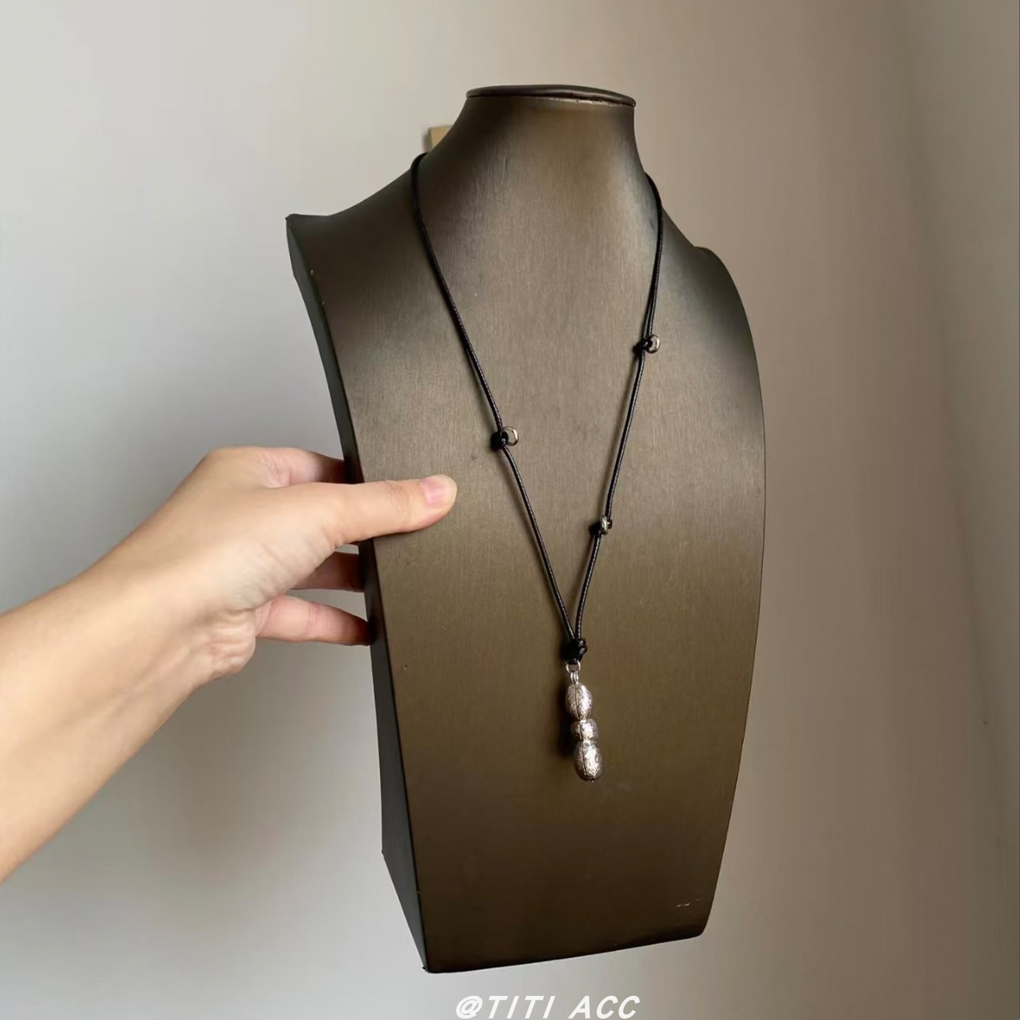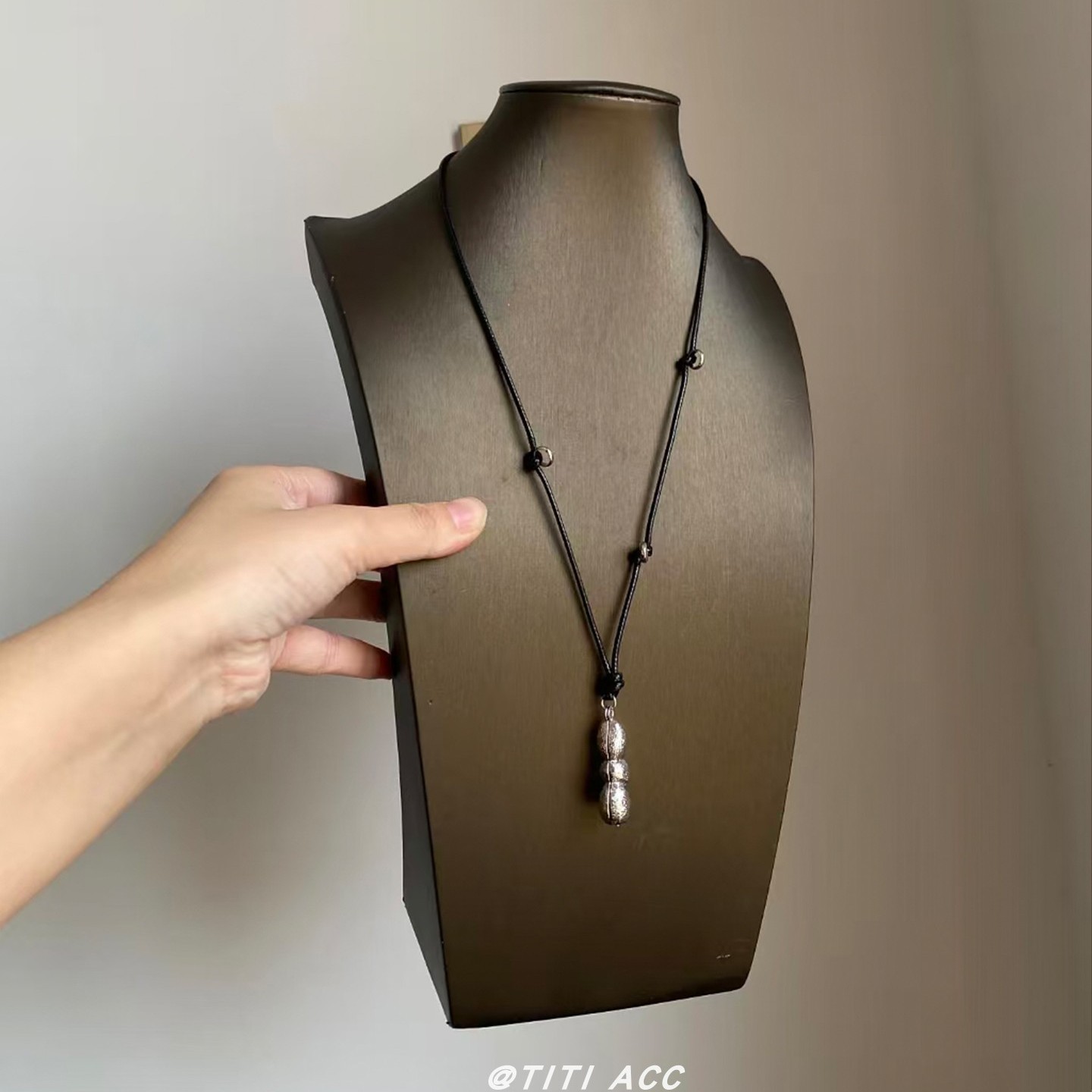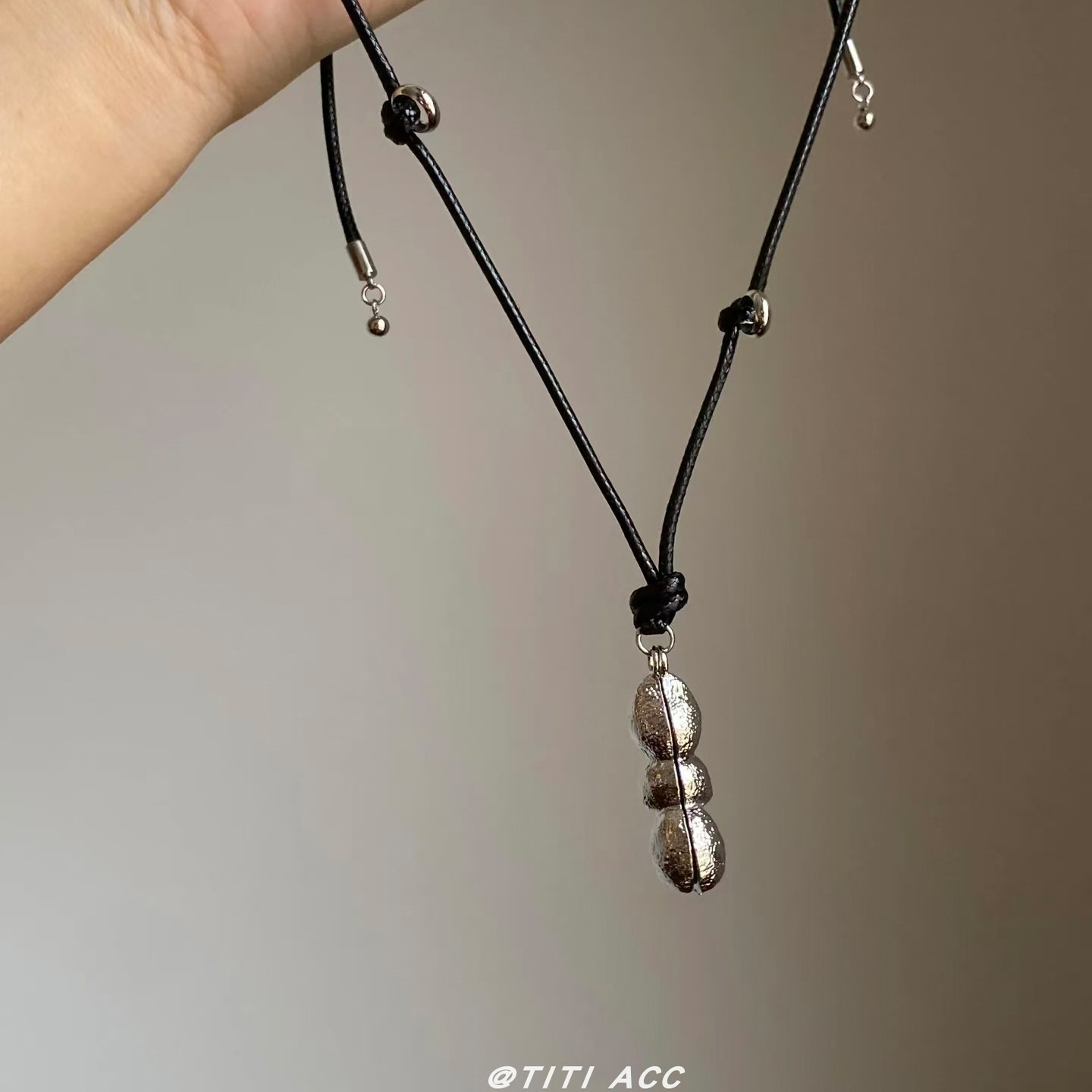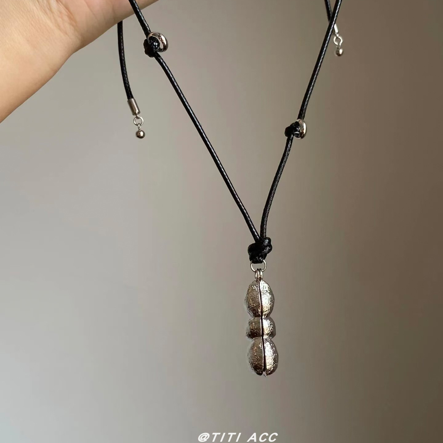 好事花生!简约设计金属珠子吊坠项链女黑色蜡绳可调节长款毛衣链