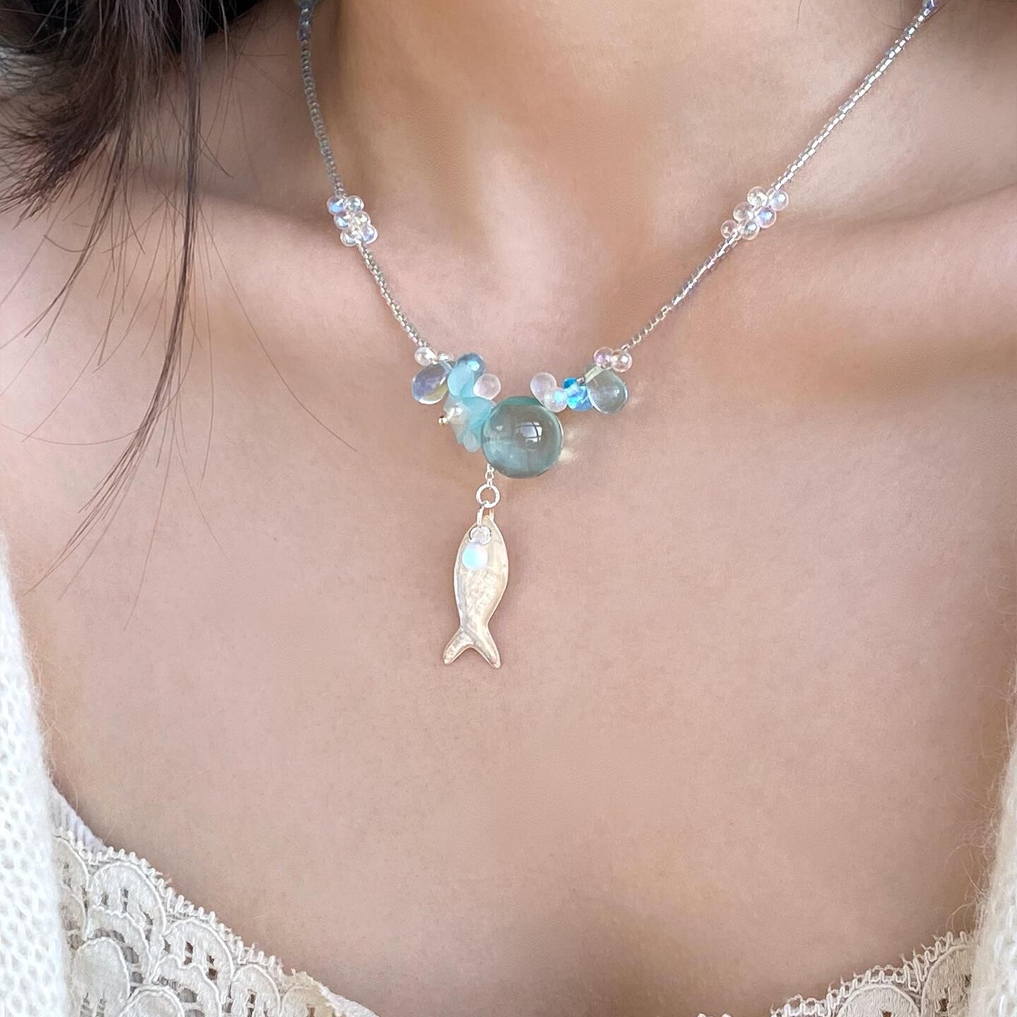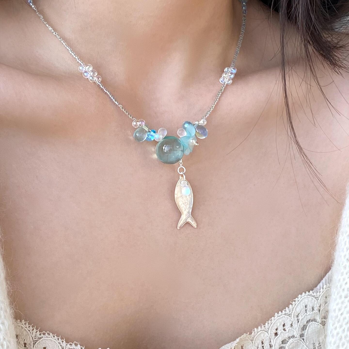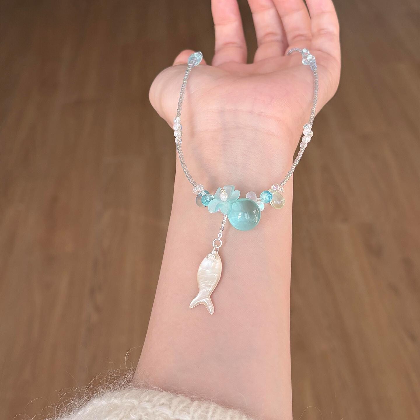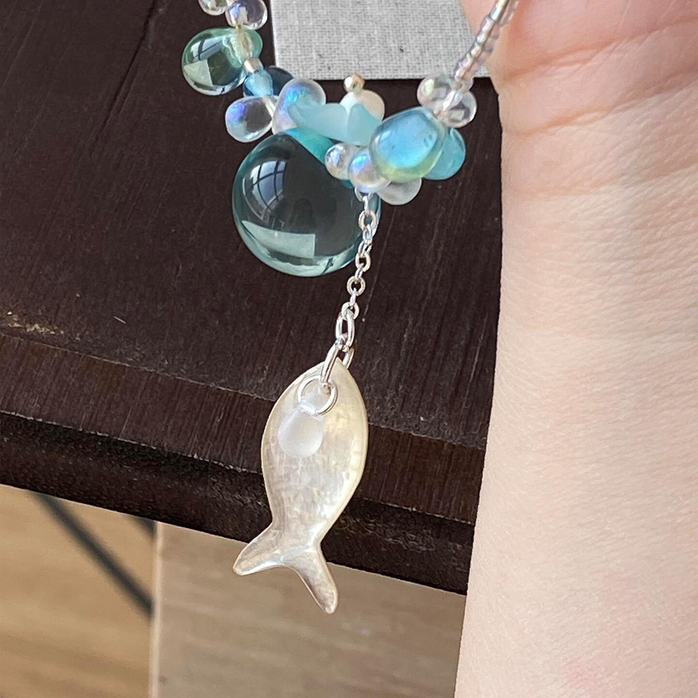 夏日度假风银色小鱼蓝色串珠项链小清新气质高级感简约百搭锁骨链