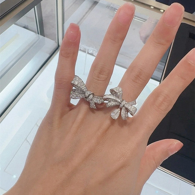 蝴蝶结戒指 女纯银白金满钻开口可调节 立体丝带指环精致时尚高级