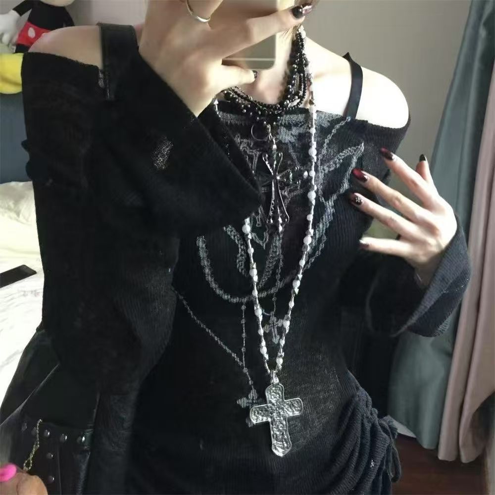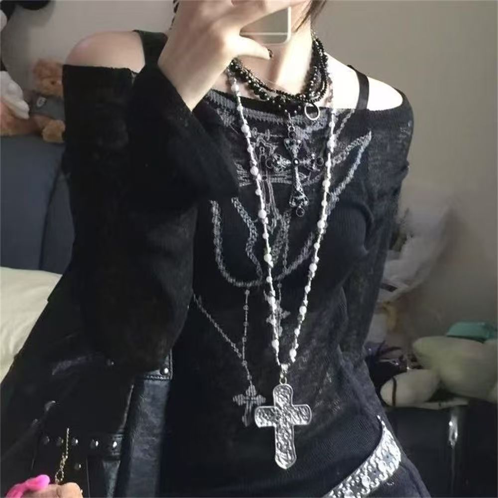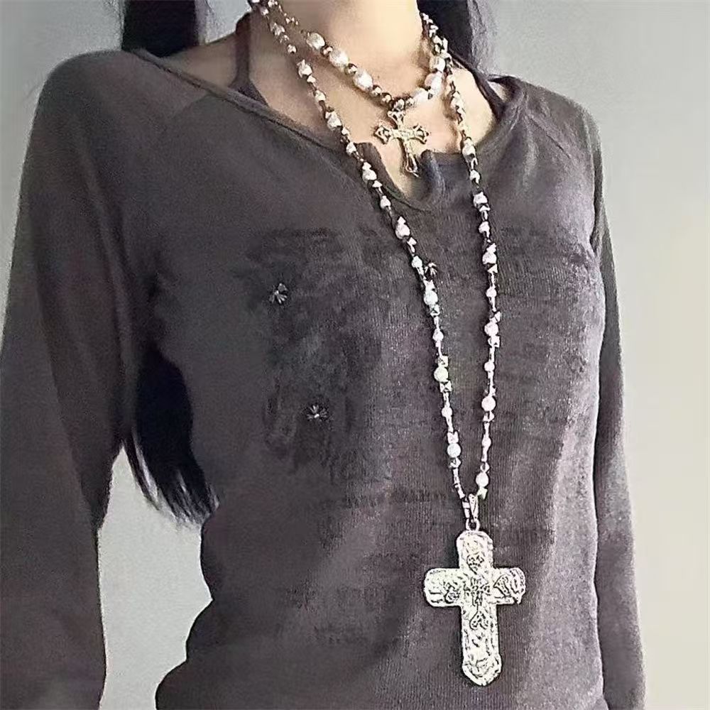 哥特十字架长款项链重工Y2K亚文化少女仿珍珠轻奢辣妹卫衣链配饰