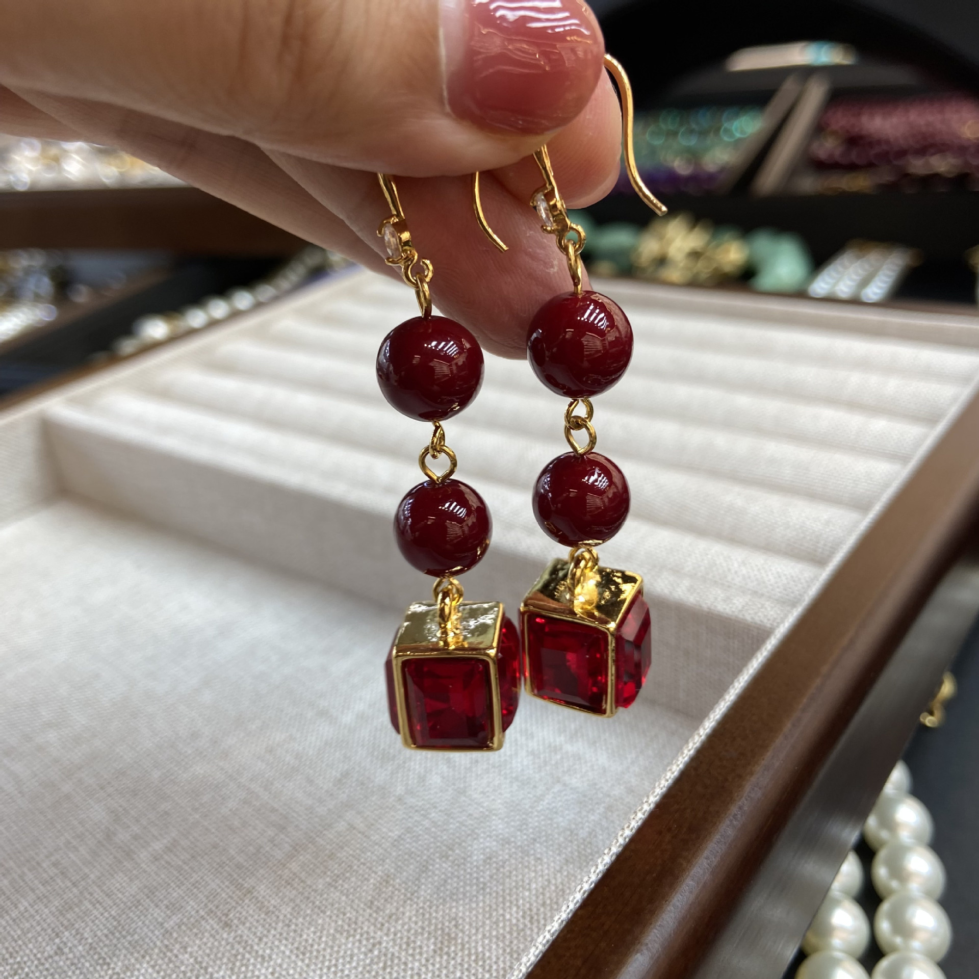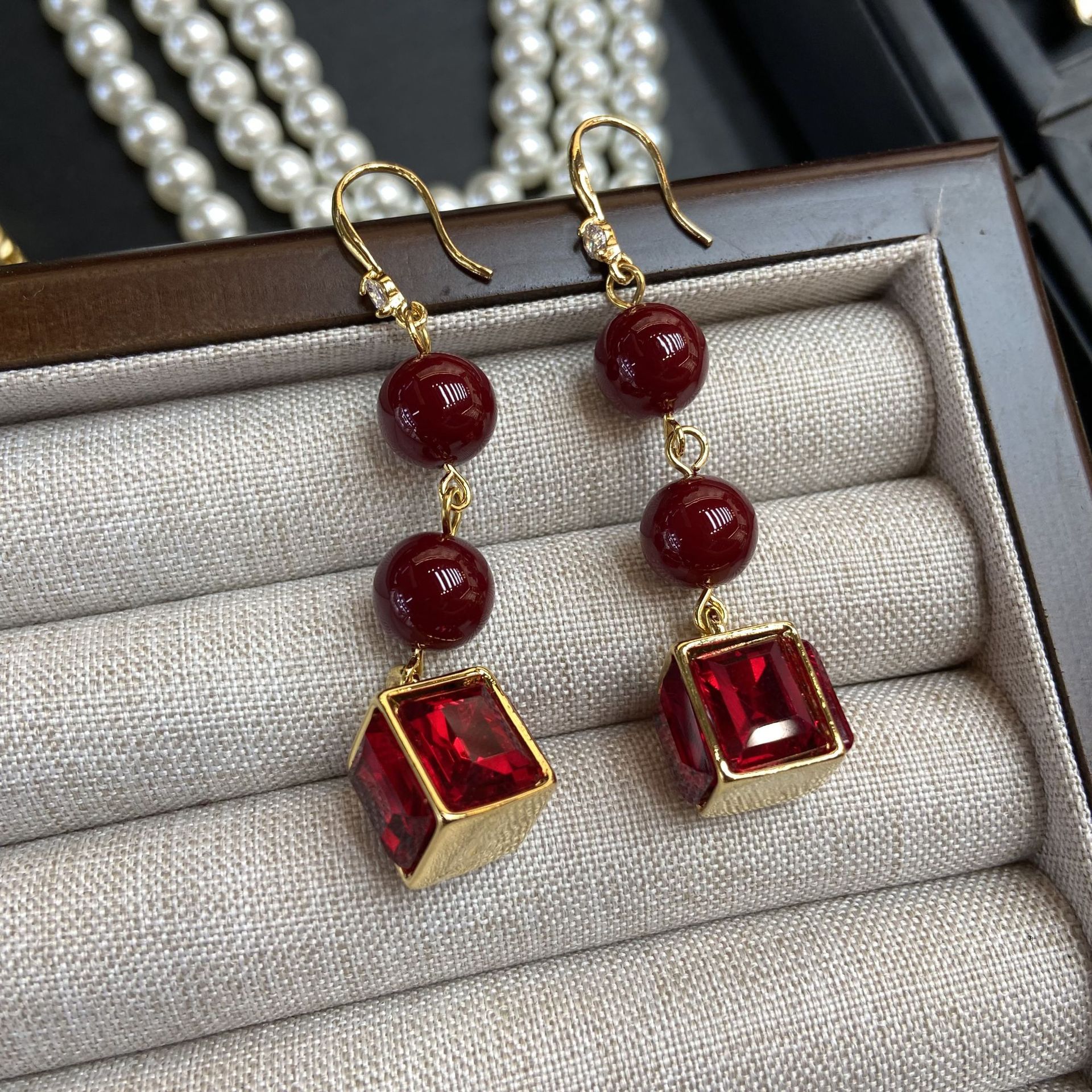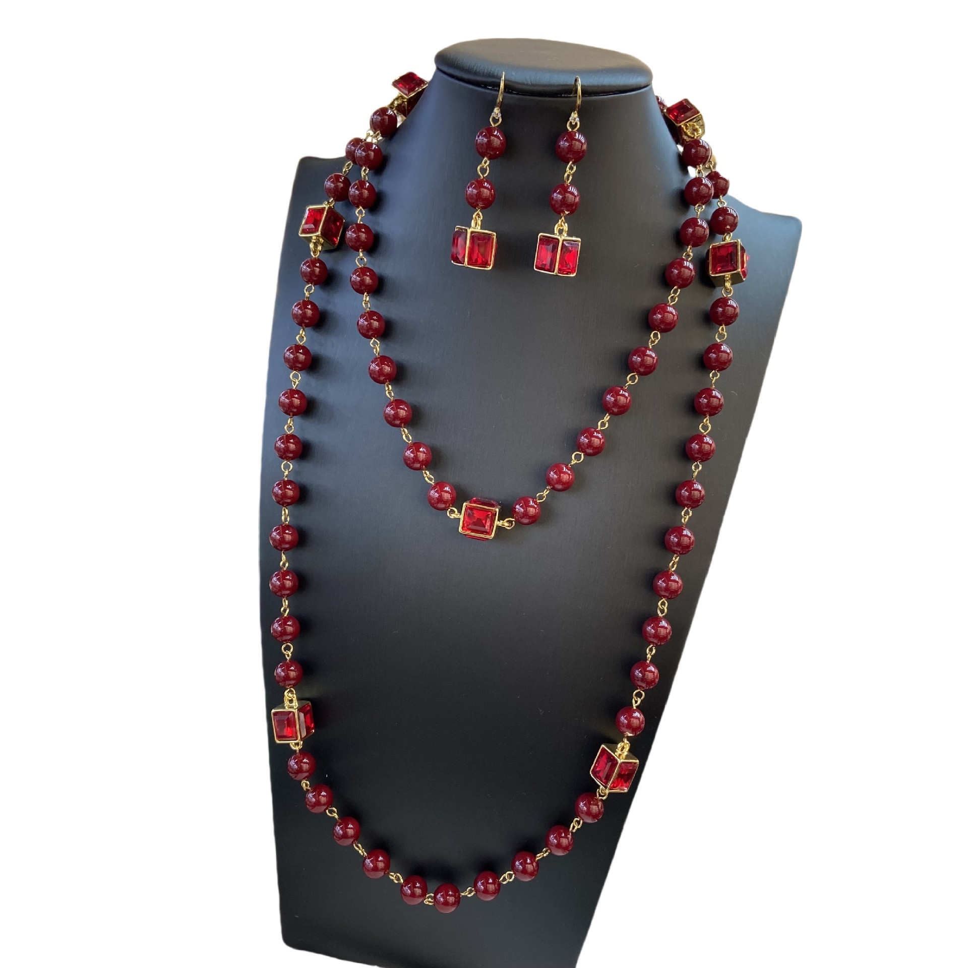 中古vintage青岛10mm施家珠长款项链毛衣链红色方糖锆石耳钩套装