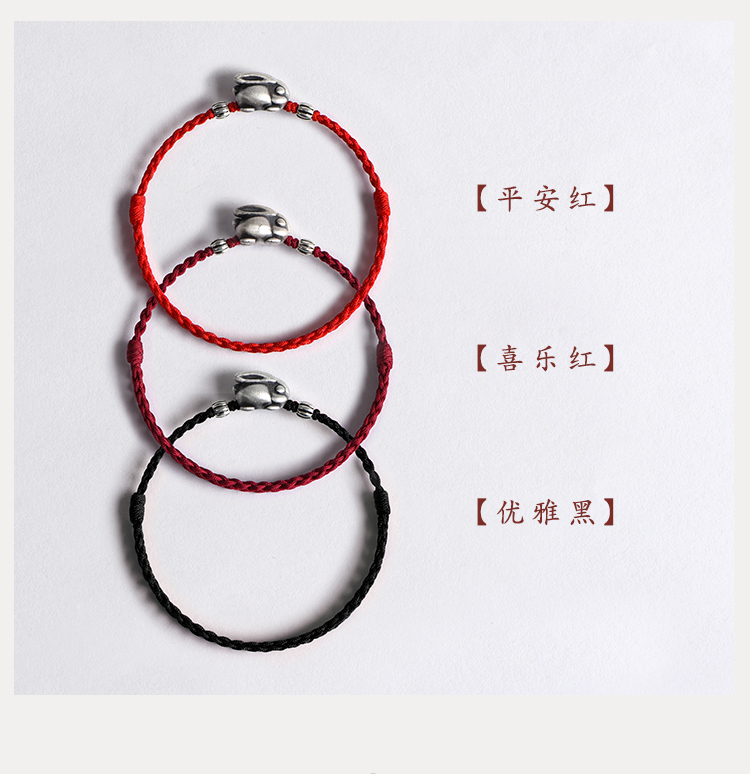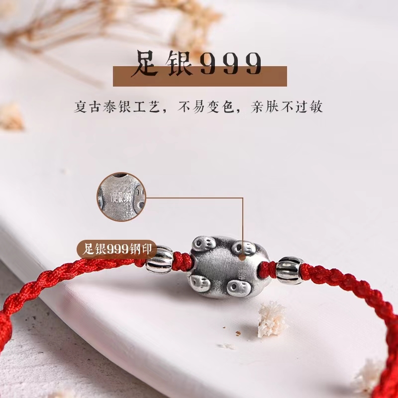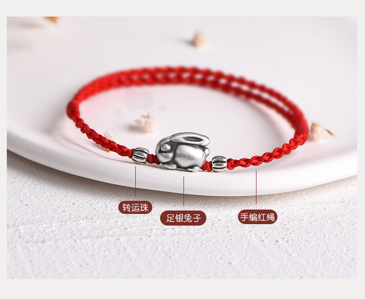 999足银生肖属兔子纯银红绳手链男女宝宝手工编织手绳本命年礼物