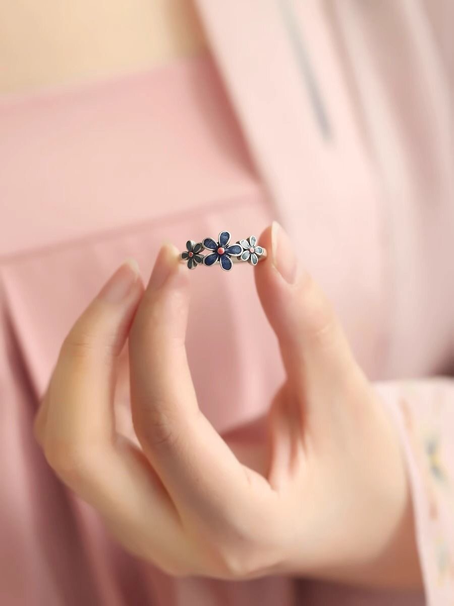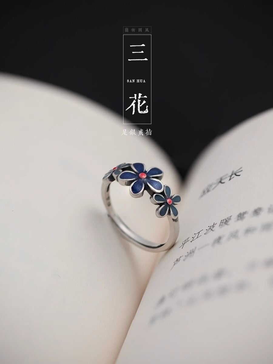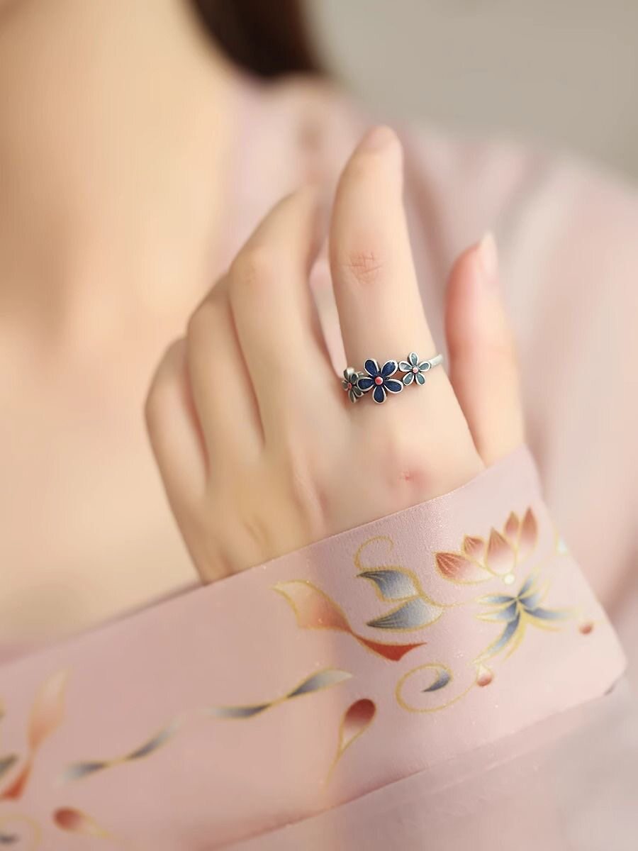 925泰银2026新款复古珐琅蓝色花朵戒指女轻奢小众设计古风国潮指