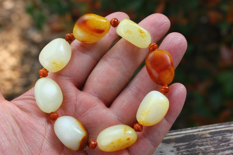 天然新疆和田玉白玉黄沁红沁籽料原石原料手链手串送证书