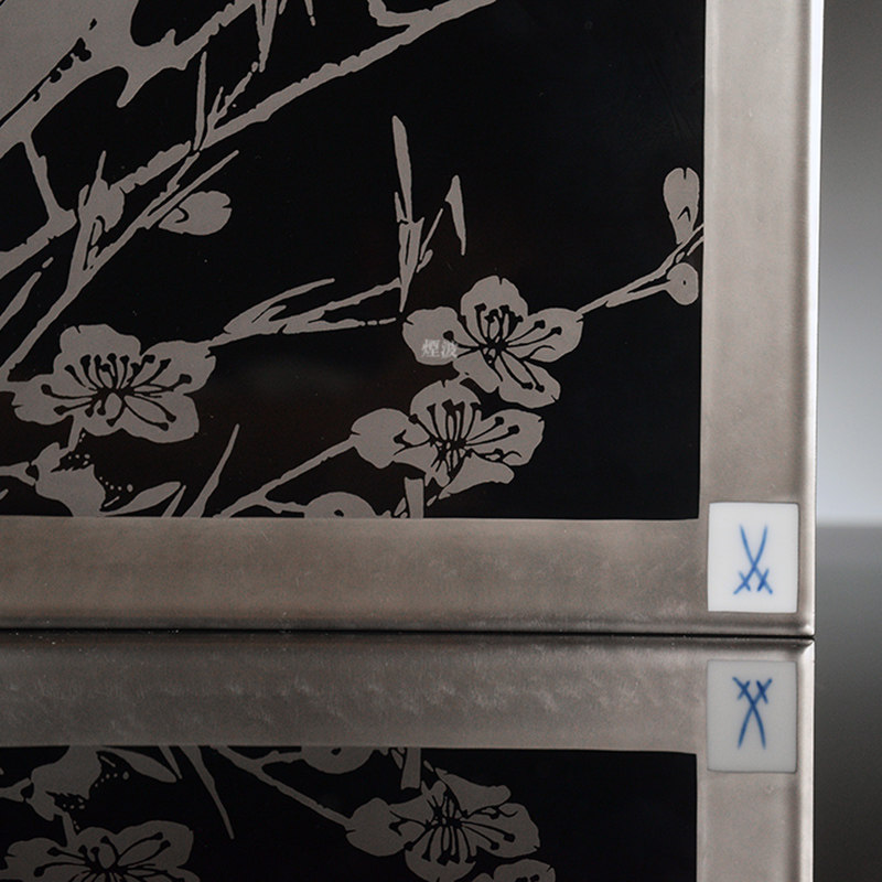 德国MEISSEN梅森瓷器 伊藤若冲 绘 黑色釉 铂金桃花 瓷板画 挂画
