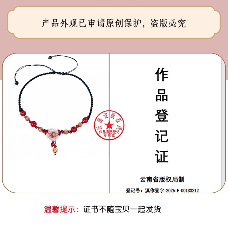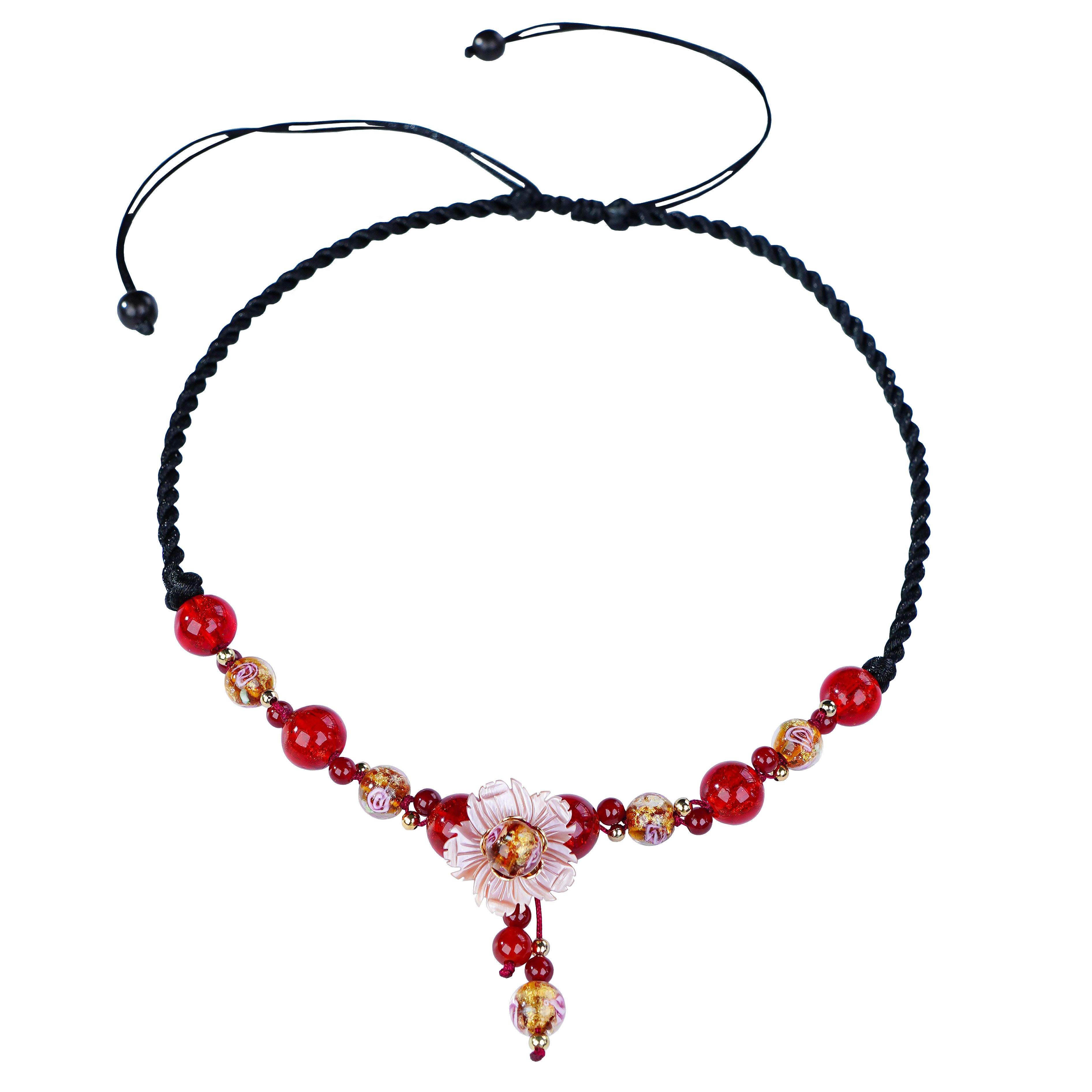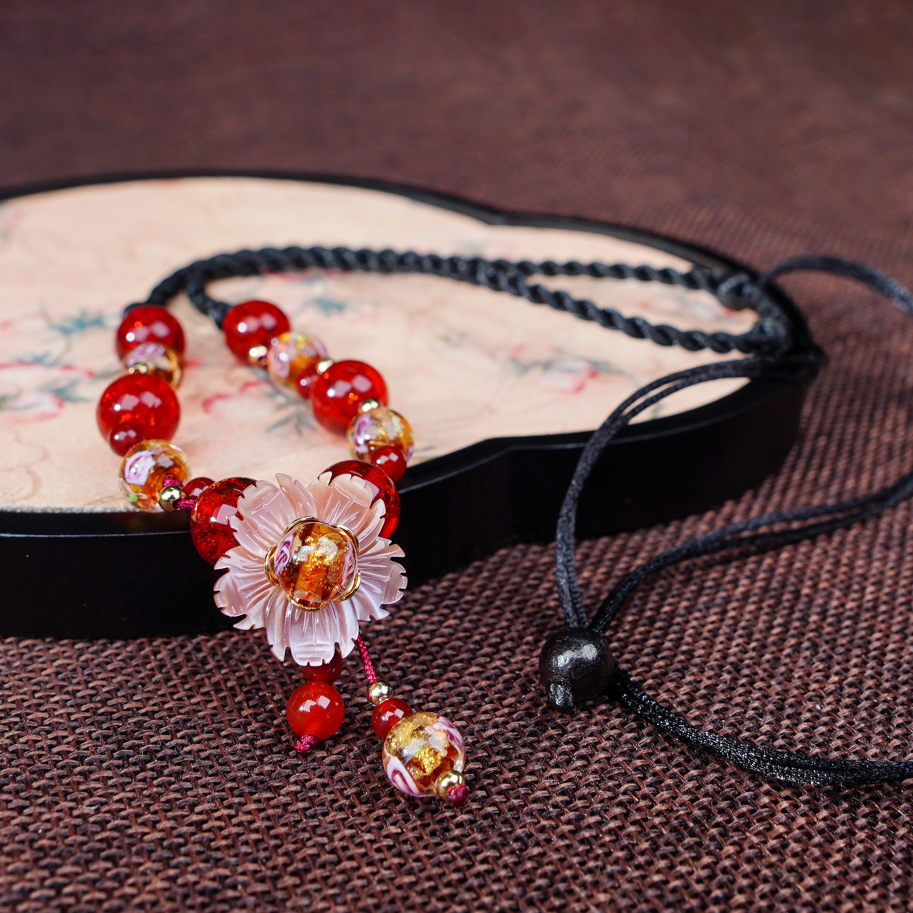 民族风红玛瑙项链女粉贝壳花朵古风颈链挂件复古锁骨链红色吊坠子