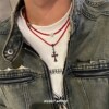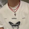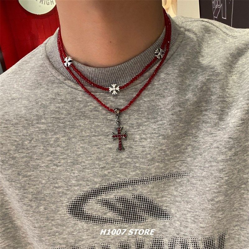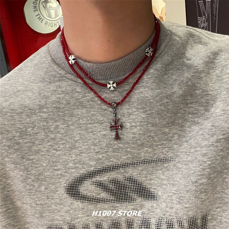 十字花红色串珠锁骨链男颈链嘻哈风项链小众设计高级感女生毛衣链