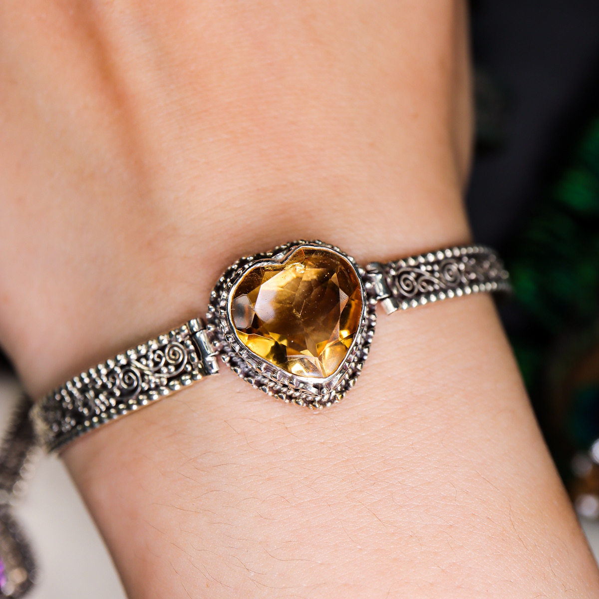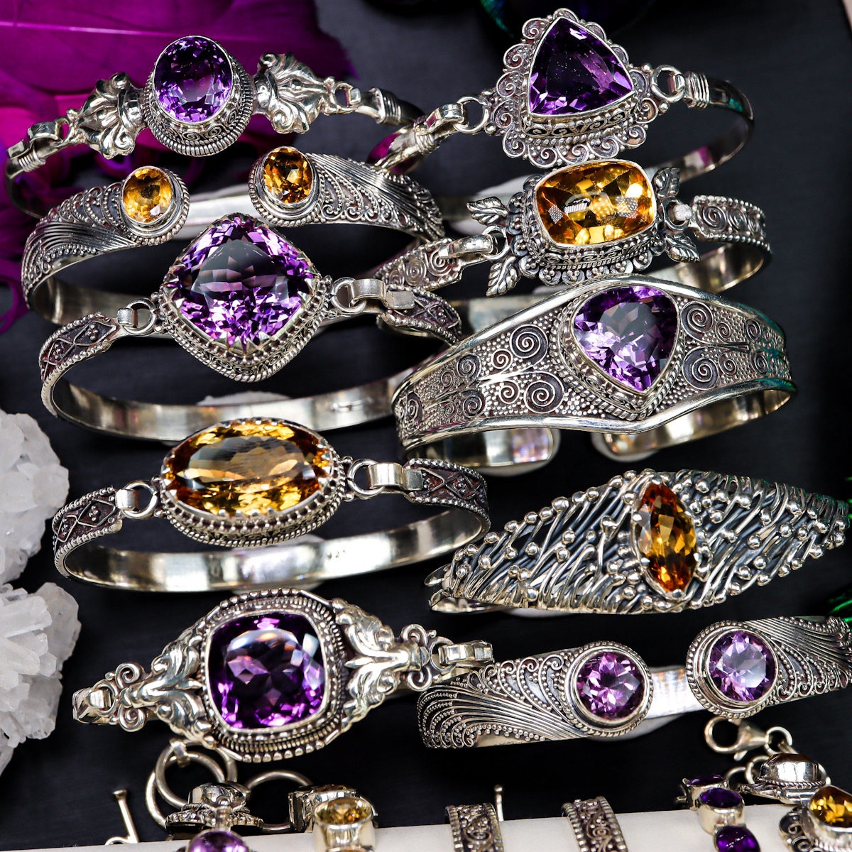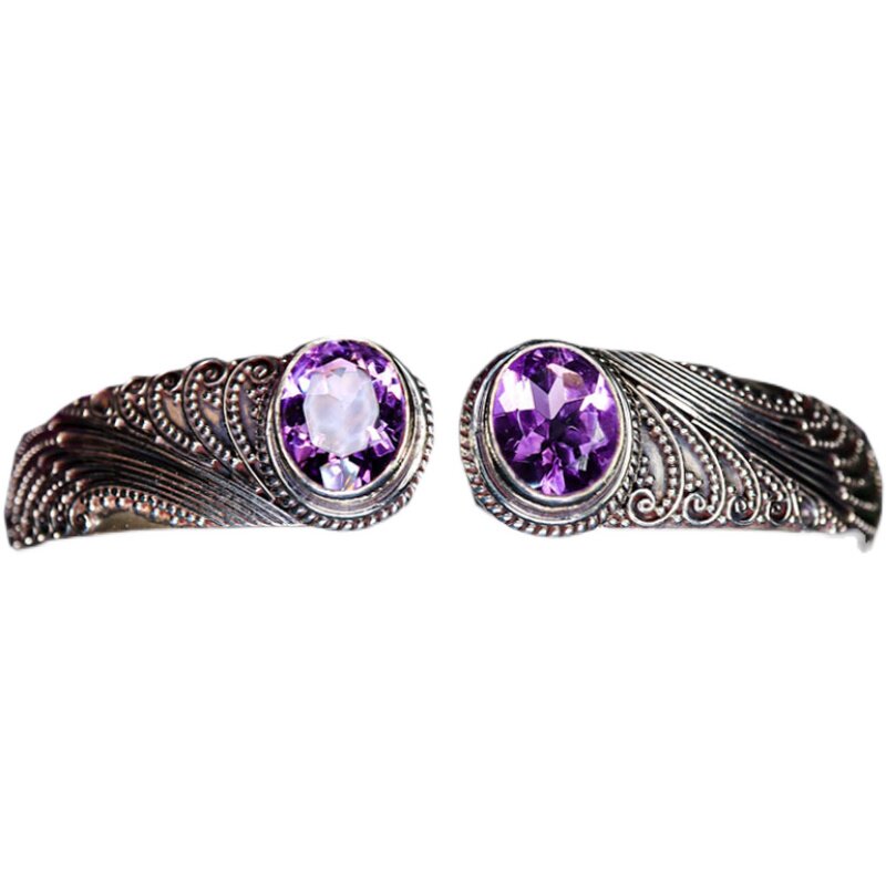 尼泊尔黄紫水晶宝石手镯手链女s925纯银复古精致手工做旧原创设计