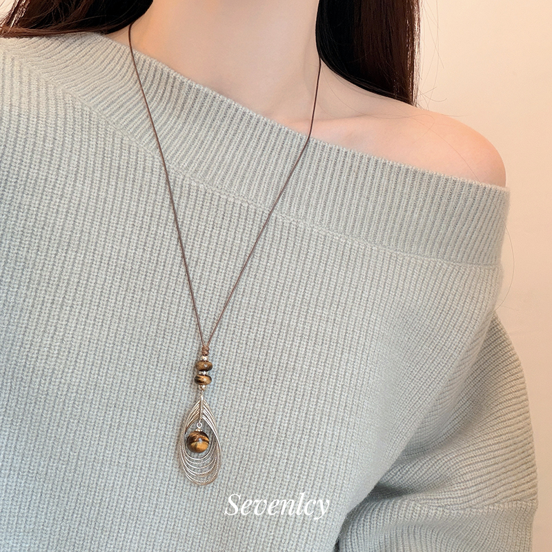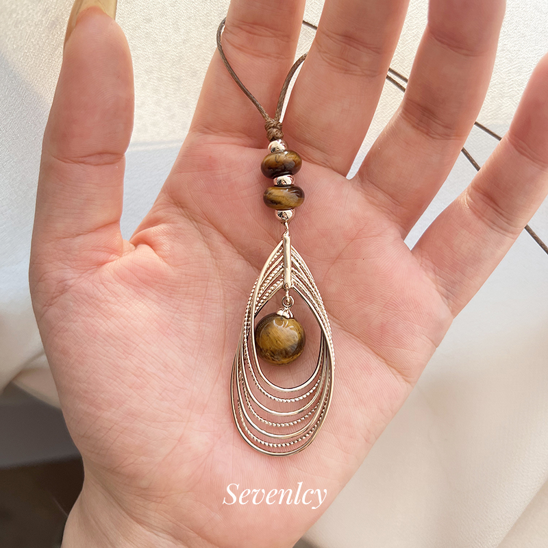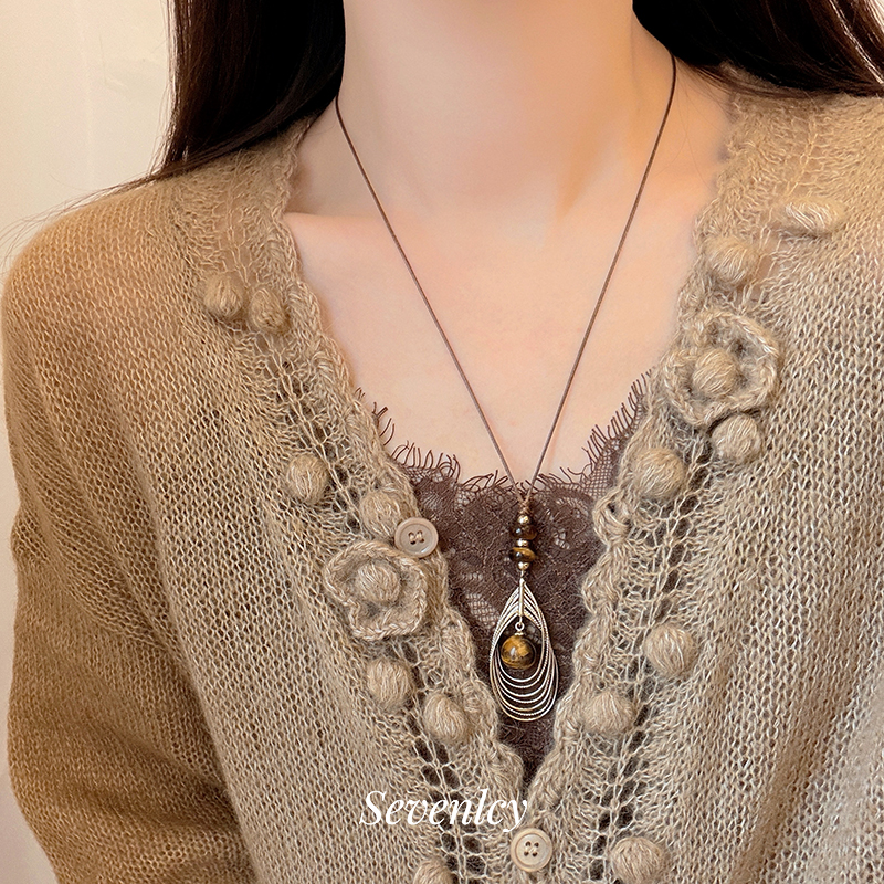 新品【秋羽旅人】复古高品~孔雀羽毛虎眼石项链毛衣链女