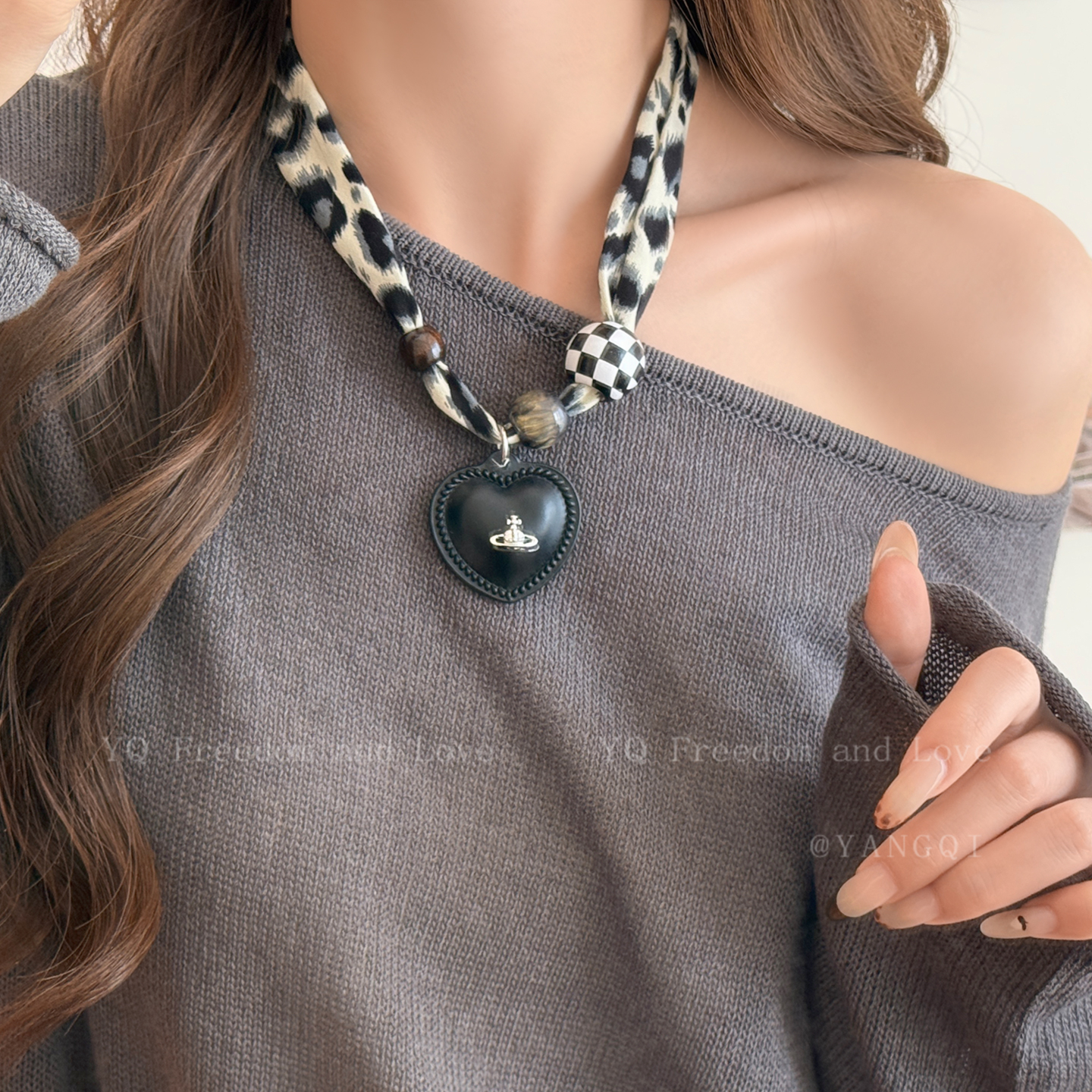 辣妹出街!灰色豹纹丝巾圆珠项链女复古设计高级感毛衣链气质配饰