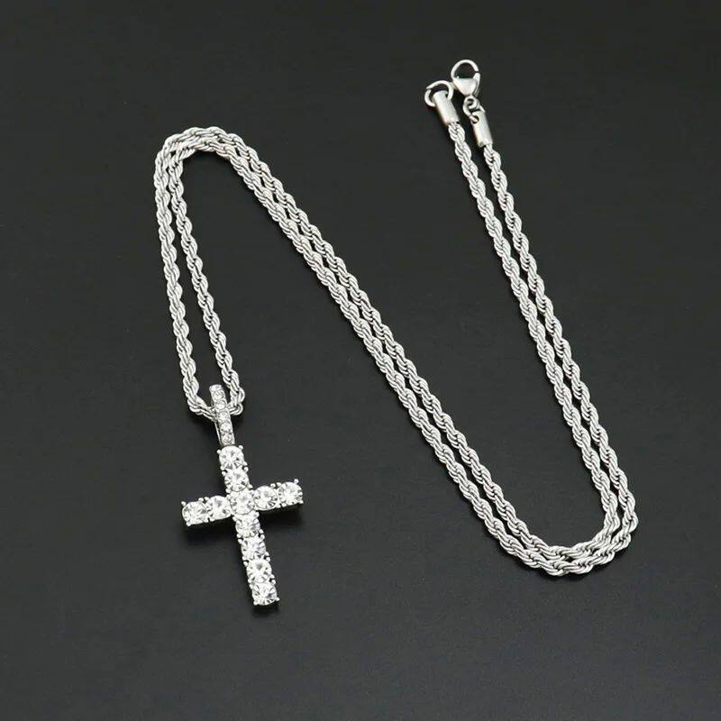 Iced Out Crystal Zircon Cross Pendant Necklace Silver Plated
