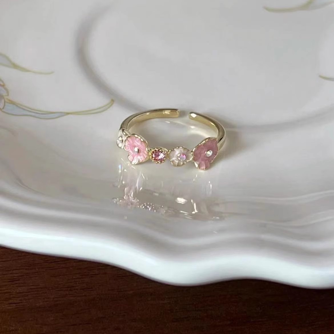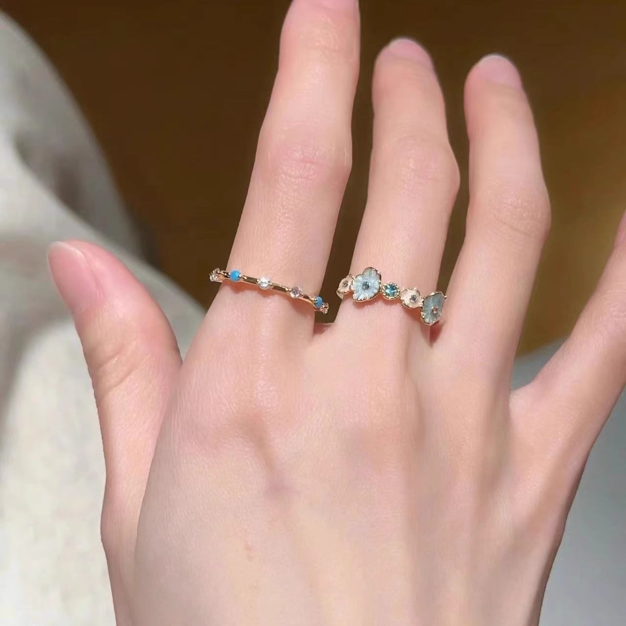 超仙蓝粉花朵戒指女小众设计高级新款食指戒可调节精致百搭开口戒