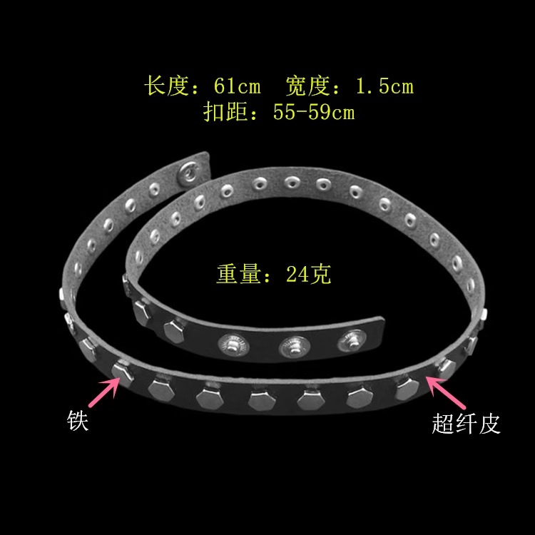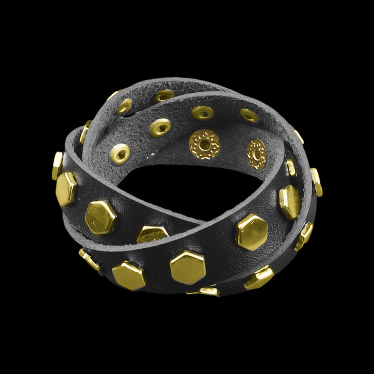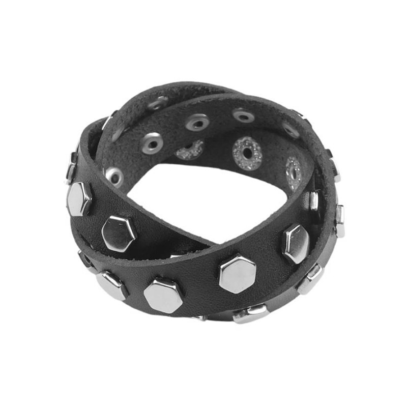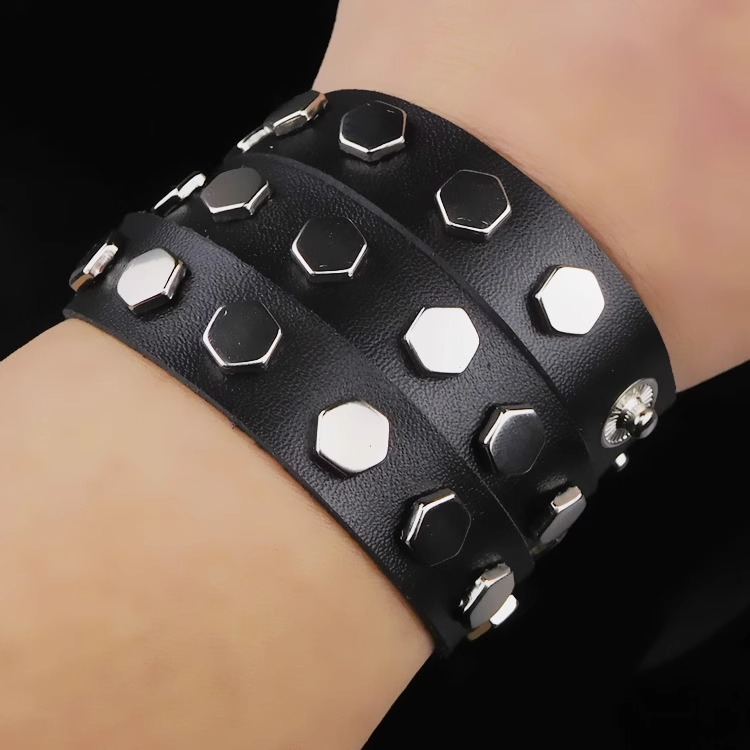 黑色柔软超纤皮银色高平六角铆钉摇滚风三圈朋克手链饰品手镯手环