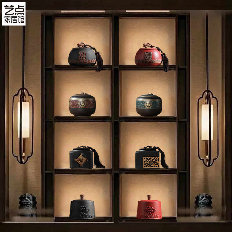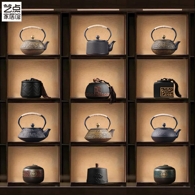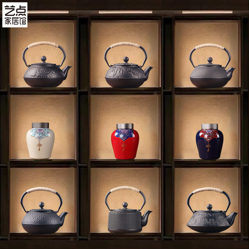 新中式茶室茶柜氛围布置摆设宋代美学摆件茶空间装饰铁茶壶茶叶罐