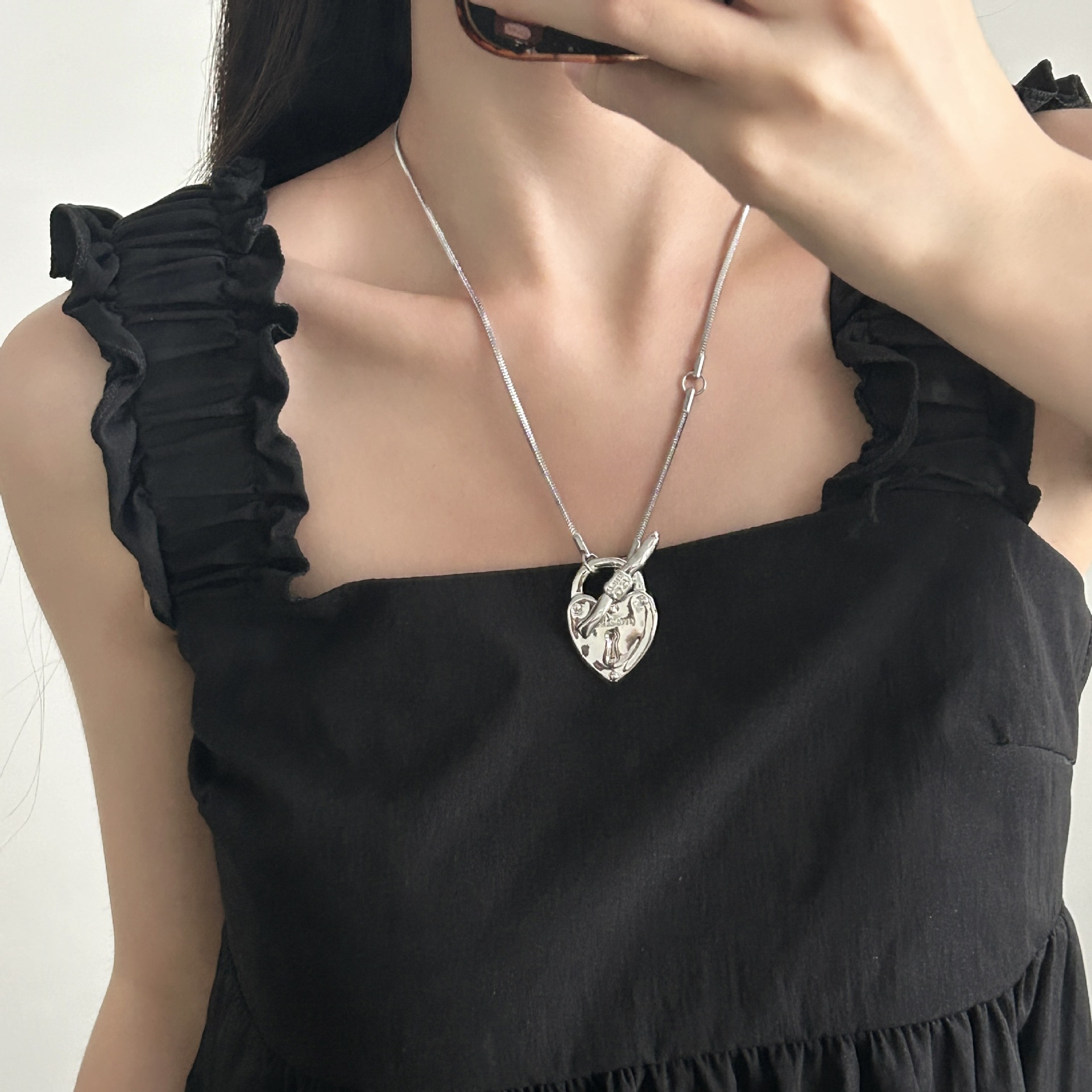 肌理感爱心锁吊坠小众个性百搭项链女手工编织黑绳毛衣链配饰